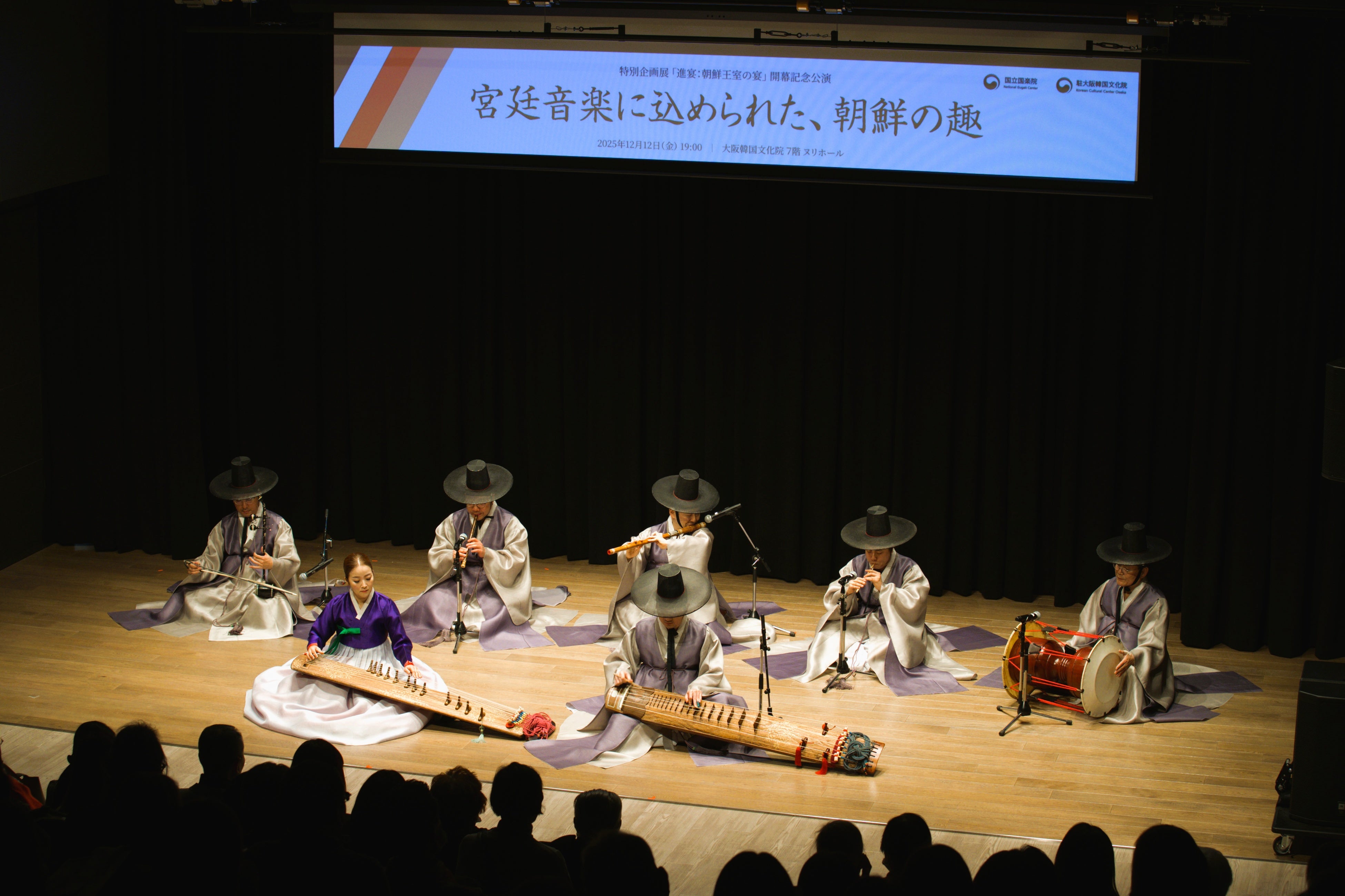 展示開幕日の12日(金)には、展示と連携した開幕記念公演<宮廷音楽に込められた、朝鮮の趣>が大阪韓国文化院 7階 ヌリホールで開催されました。宮廷芸術を中心に企画した今回の公演では、「壬寅進宴図屏」の中にも登場する宮廷舞踊「春鶯囀(チュネンジョン)」をはじめとする宮廷舞踊の多様な様子がうかがえ、観客から多大なる好評を得ました。