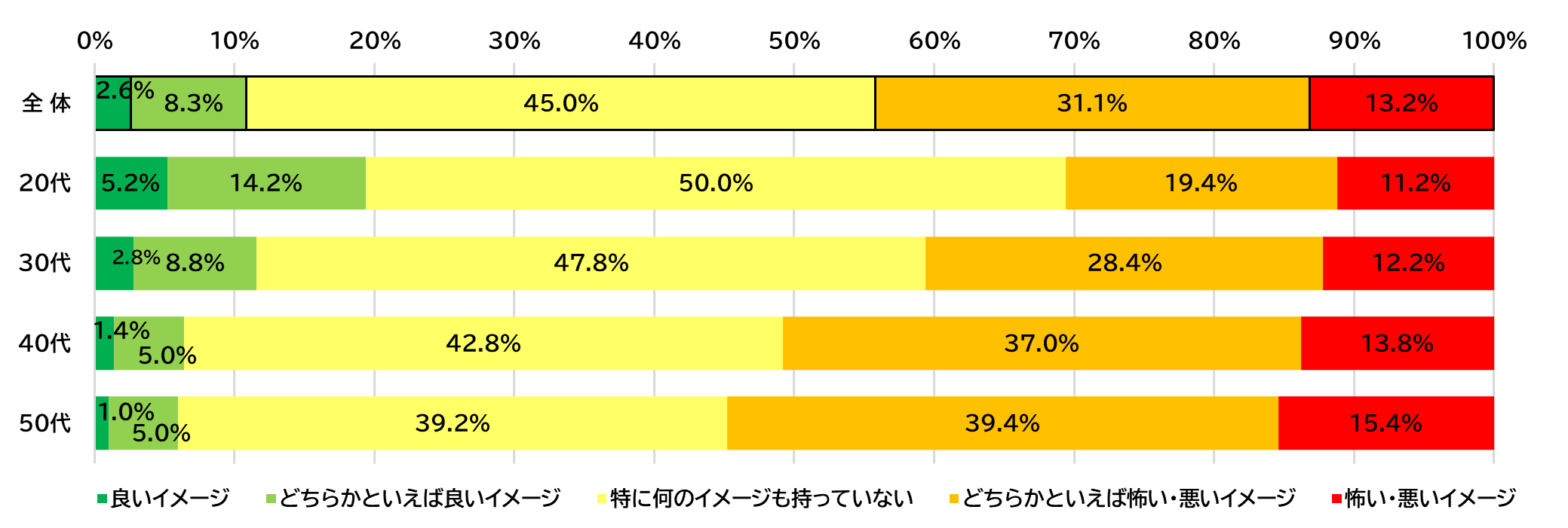 遺伝子組み換え食品についてどのようなイメージを持っているかとの問いに「特に何のイメージも持っていない」と答えた人が最も多く、全体の45%でした。若年層ほど否定的な回答が少なく、20代では「良い」「どちらかといえば良い」(好意的)と「特にイメージなし」(中立的)の合計が約7割を占めています。