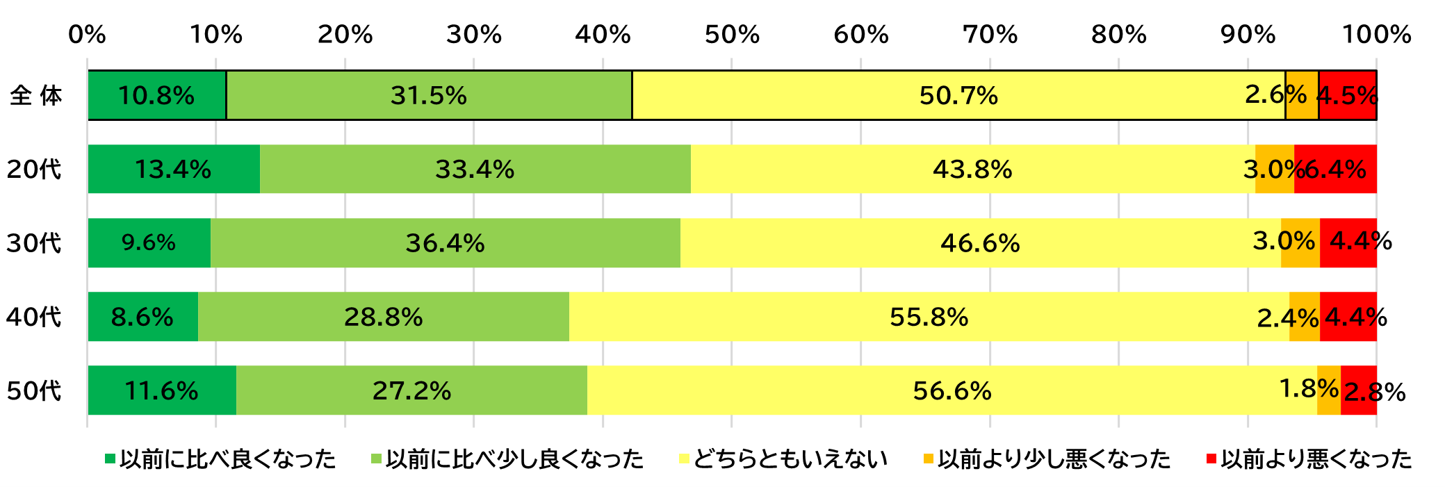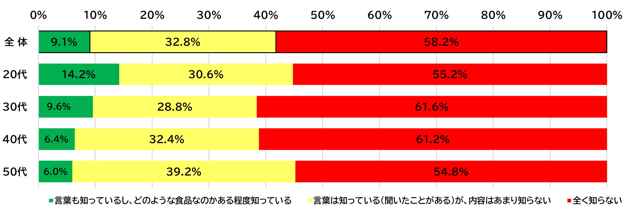 ゲノム編集食品については、全体の58.2%が「全く知らない」と回答し、内容まで理解している層はわずか9.1%にとどまりました。年代別に見ても「全く知らない」という回答が20代~50代のすべてで過半数を占めており、年代に関わらず、ゲノム編集食品についての知識が広く行き渡っていないことが分かりました。また、全体の51.2%が「全く知らない」と回答した前回(2021年)の調査結果と比べても、認知度は広がっていませんでした。