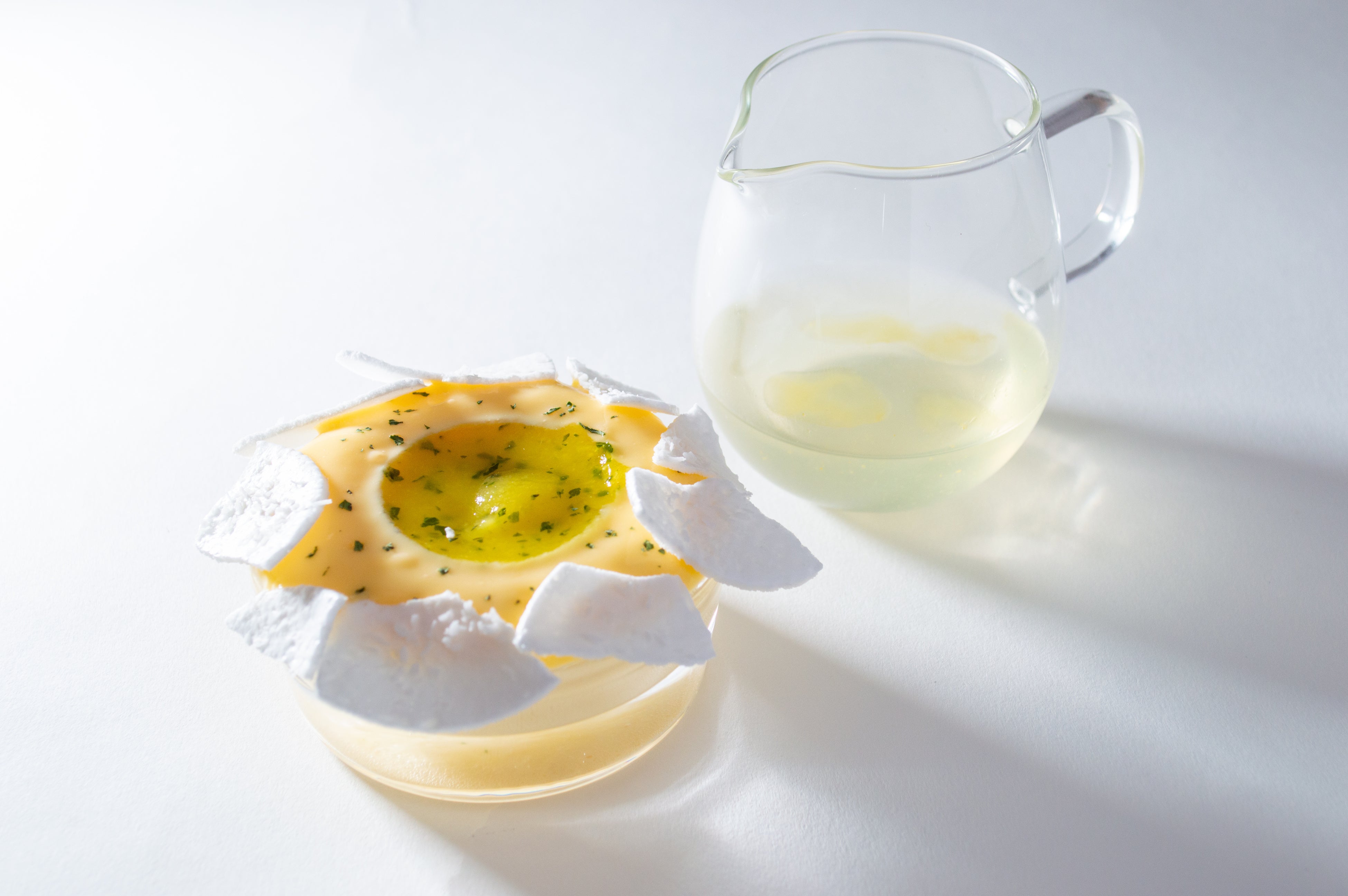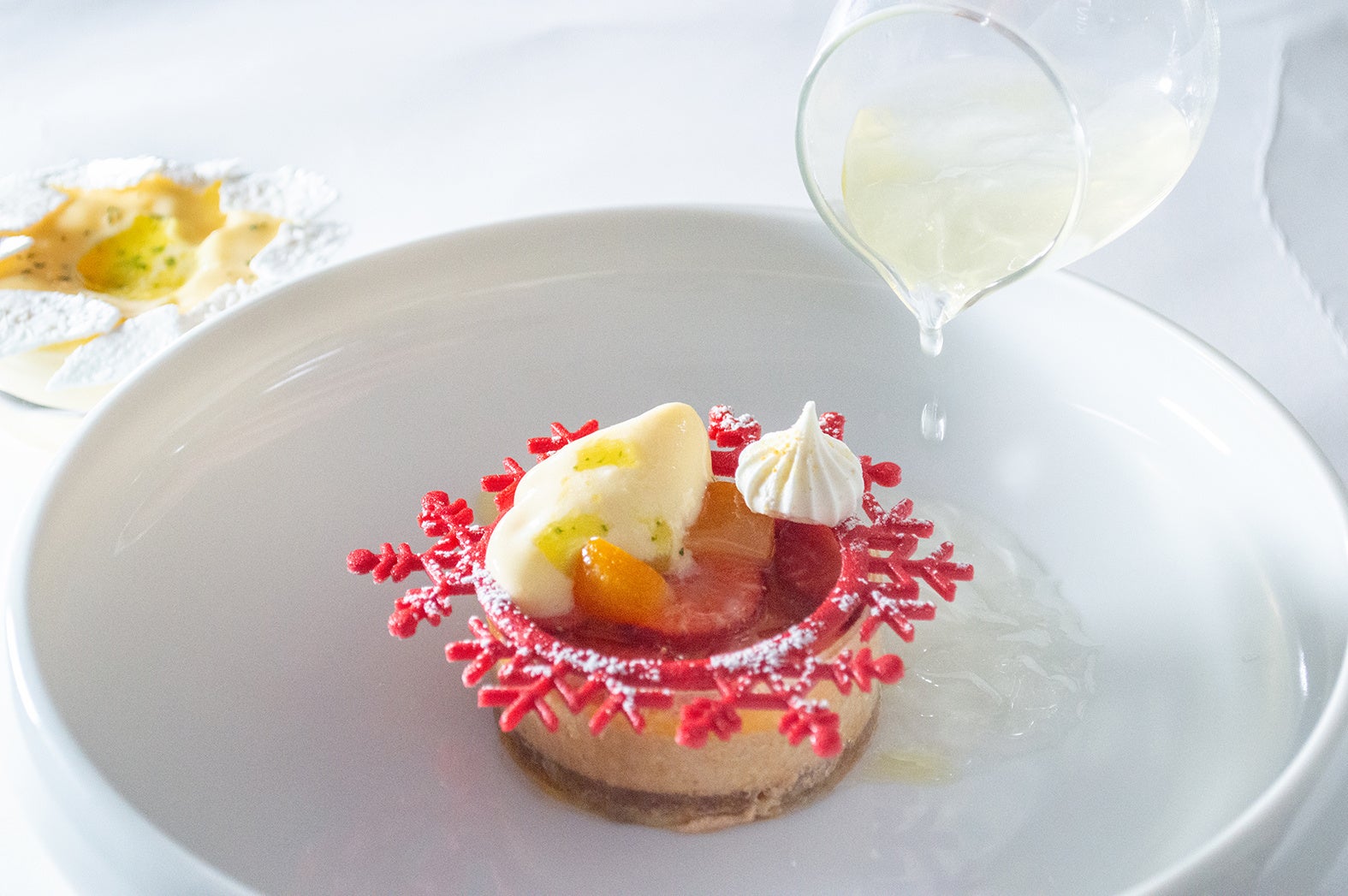 冬の森をイメージした苺と柚子のクリスマスデセールは2種類のソースでいただきます。淡い緑色のソースは、白ワインに柚子の香りをつけた泡と柚子ミントの軽い口当たりのソース。透明のソースは、柚子・クロモジ・緑茶を組み合わせた爽やかなジュレとなっております。籏のイメージする冬の森の香りを体験してみてください。