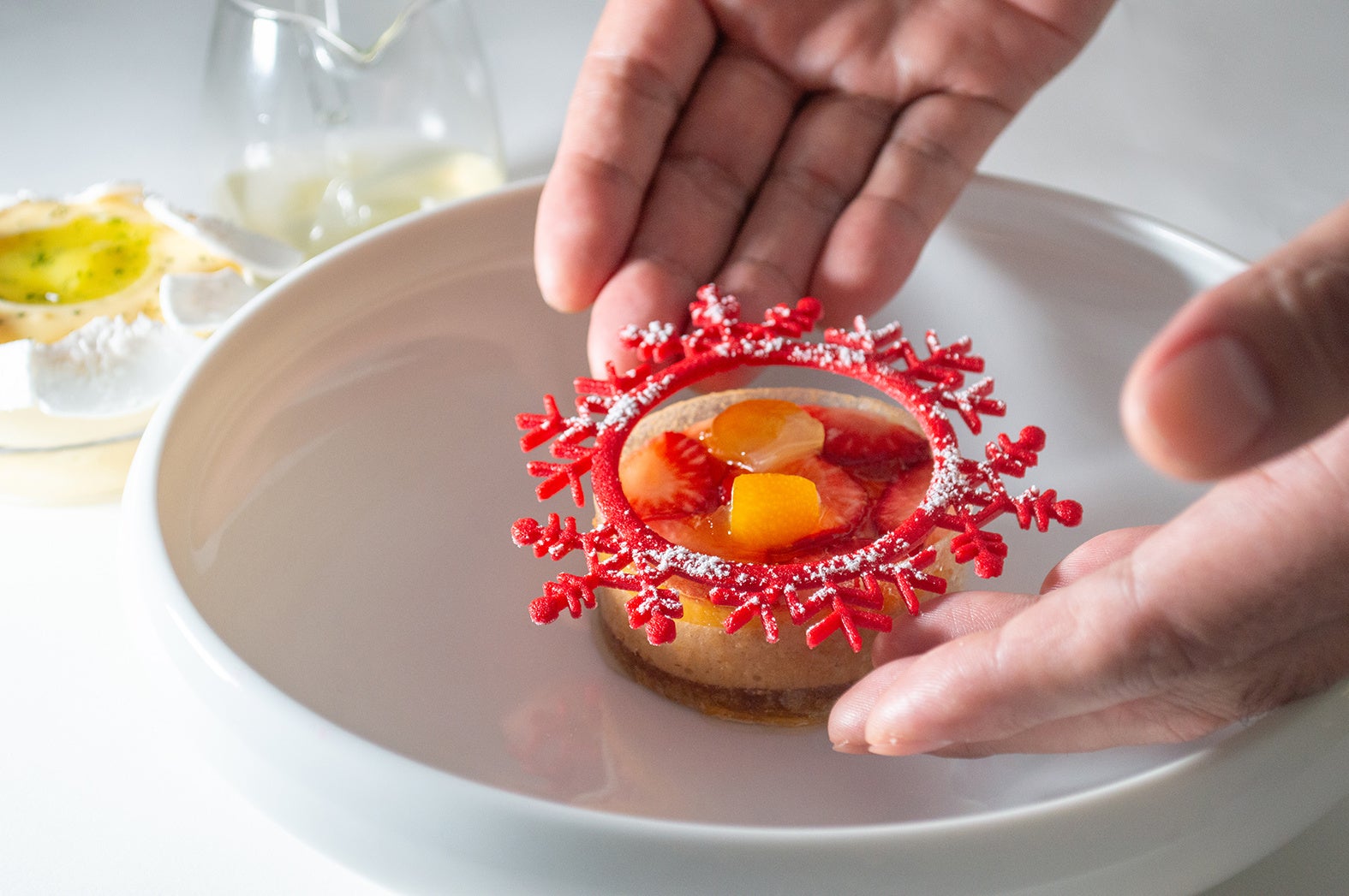 フレッシュな苺と金柑の上に乗るのは、赤い雪の結晶。籏のイメージをデザインに落とし込んで作成したオリジナルの模様です。世界大会のデザートでも繊細な飾りがデザートの美しさをより引き立てました。チョコレートパルフェをベースに柚子クリームやスパイスクッキー、アメチップで仕上げています。華やかな見た目と立体的な味わいをお楽しみください。
