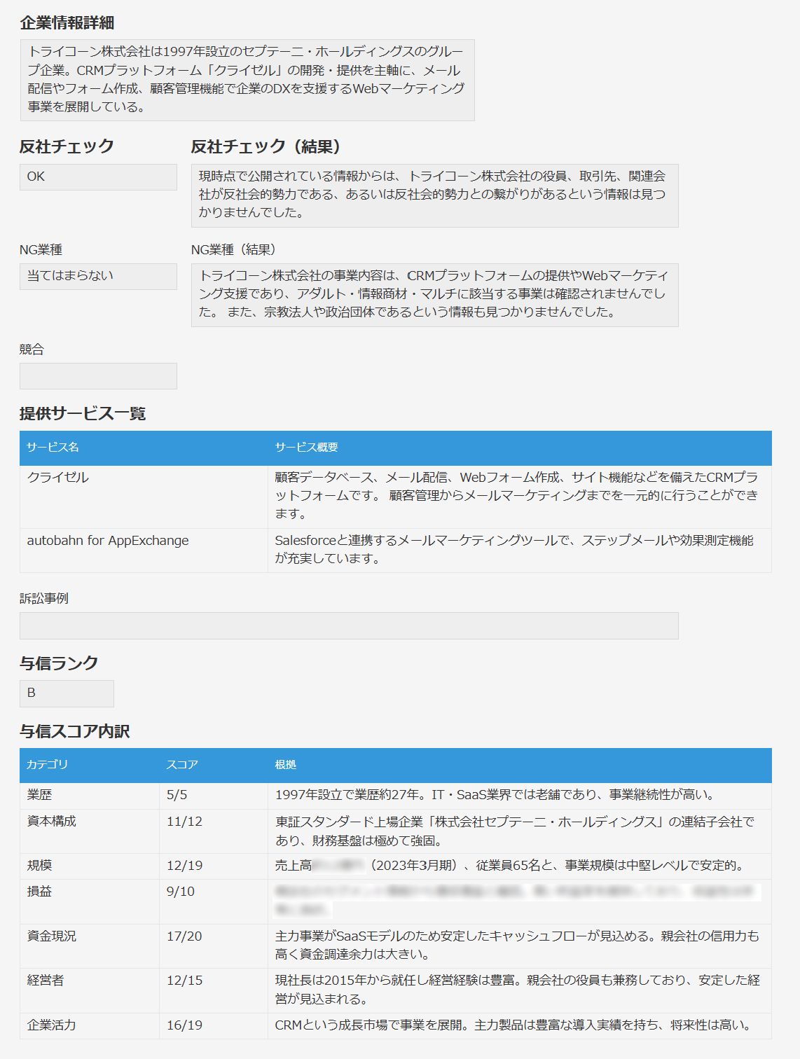 取得した企業情報表示例(トライコーン株式会社の場合)