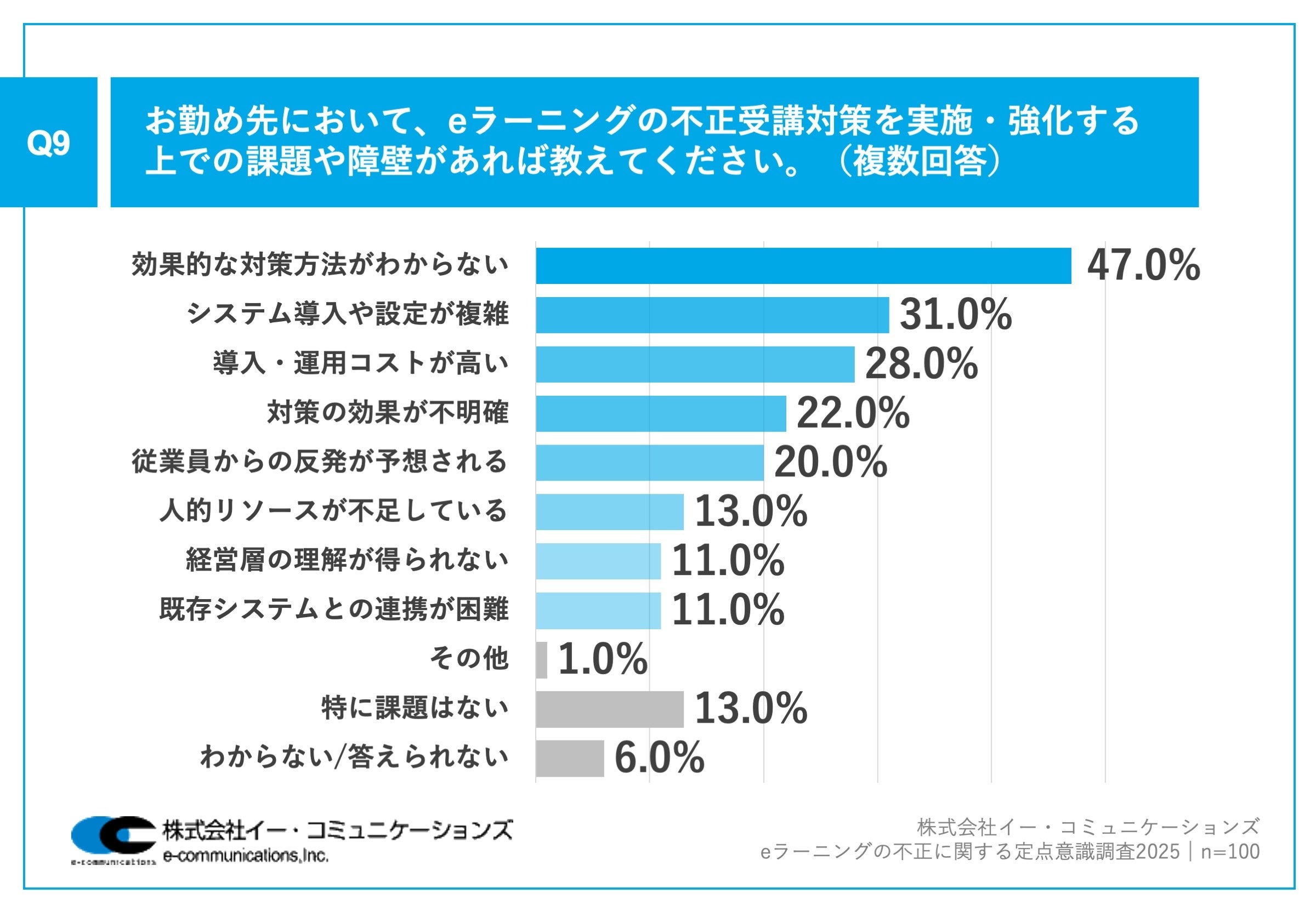 「【新規】Q9. お勤め先において、eラーニングの不正受講対策を実施・強化する上での課題や障壁があれば教えてください。(複数回答)」(n=100)と質問したところ、「効果的な対策方法がわからない」が47.0%、「システム導入や設定が複雑」が31.0%、「導入・運用コストが高い」が28.0%という回答となりました。