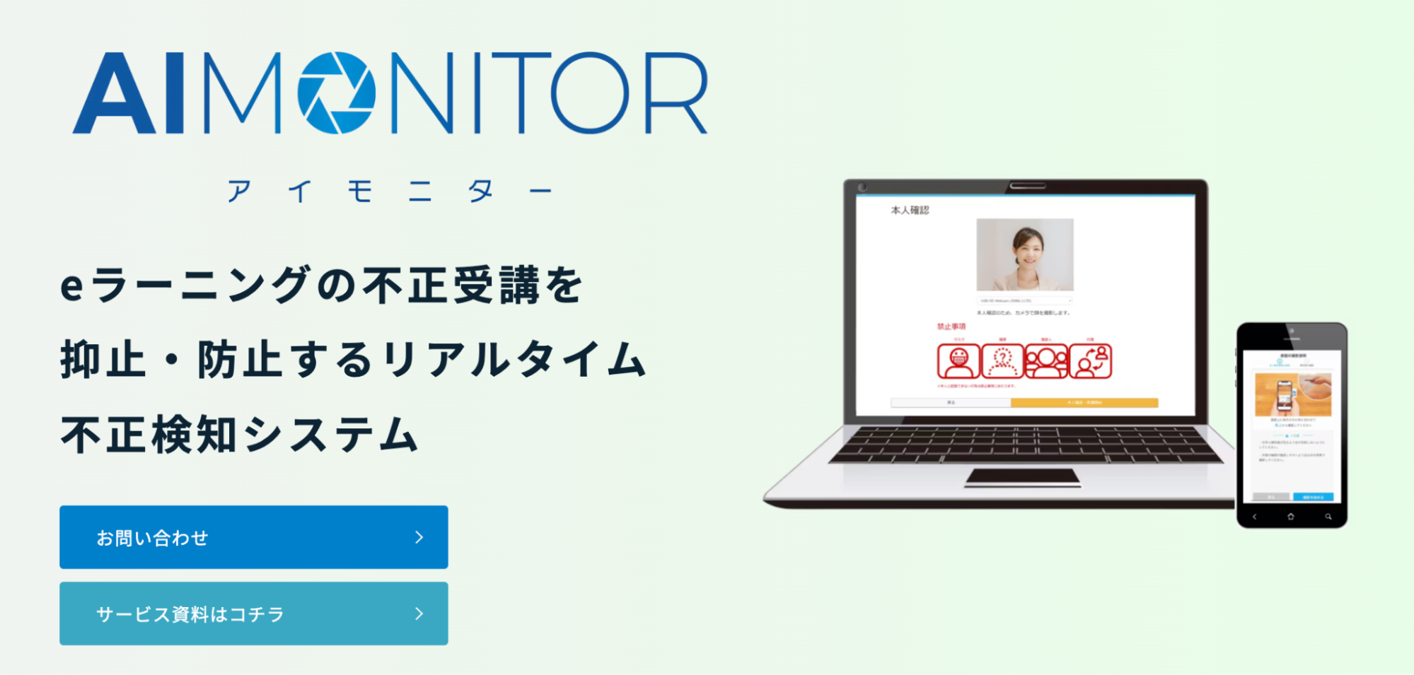 eラーニングによるコンテンツの受講では、「受講者が動画を見ていない」(離席)、「受講者が入れ替わっている」(なりすまし)、「受講者以外も受講している」(複数人による受講)など、いわゆる不正受講が起こりがちです。サクテスAIMONITORはeラーニング受講前に本人認証、登録を行い、受講中、Webカメラやスマホのカメラでリモート監視をし続けることで、不正受講を検知するAI × クラウドサービスです。