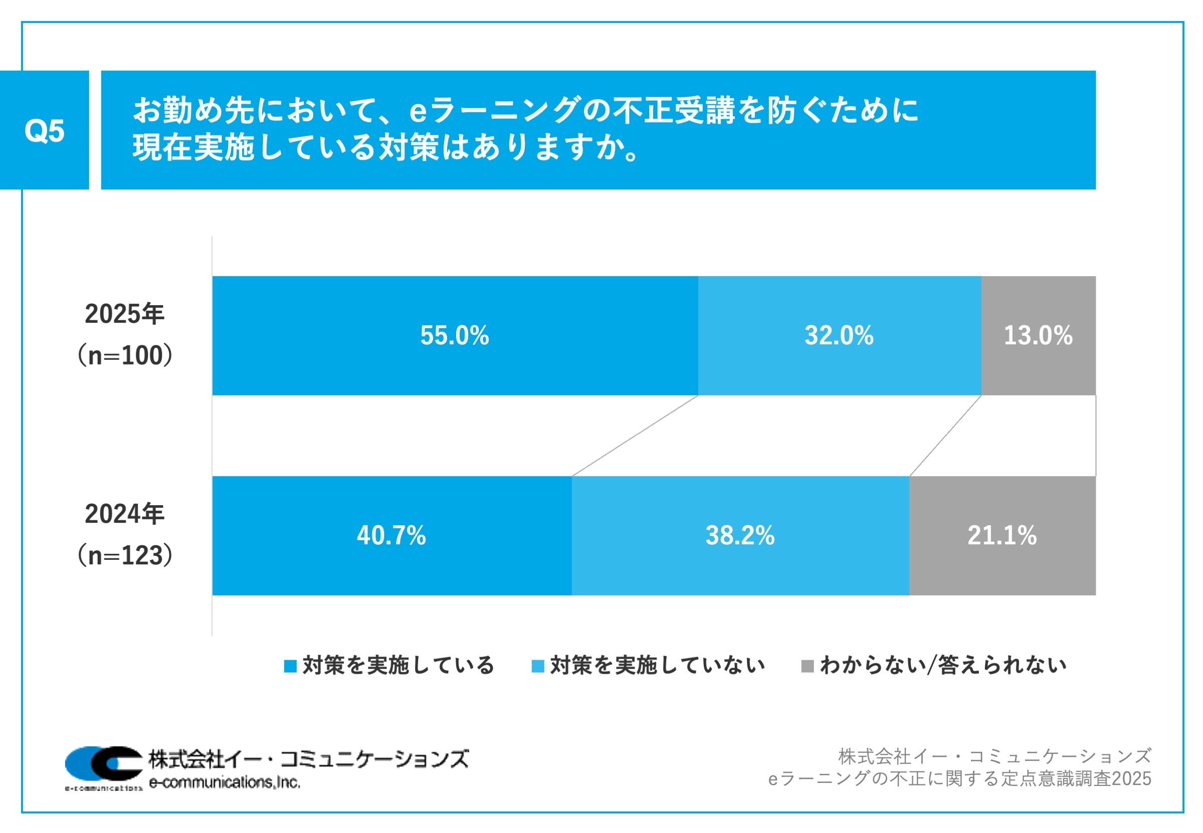 「【定点】Q5. お勤め先において、eラーニングの不正受講を防ぐために現在実施している対策はありますか。」(n=100)と質問したところ、「対策を実施している」が55.0%、「対策を実施していない」が32.0%という回答となりました。