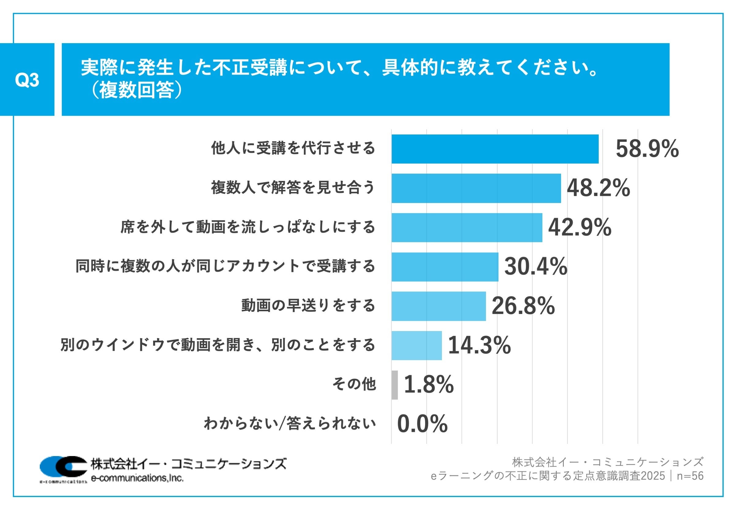 「【新規】Q3. Q2で「発生したことが確認されている」「発生した可能性がある」と回答した方にお聞きします。実際に発生した不正受講について、具体的に教えてください。(複数回答)」(n=56)と質問したところ、「他人に受講を代行させる」が58.9%、「複数人で解答を見せ合う」が48.2%、「席を外して動画を流しっぱなしにする」が42.9%という回答となりました。