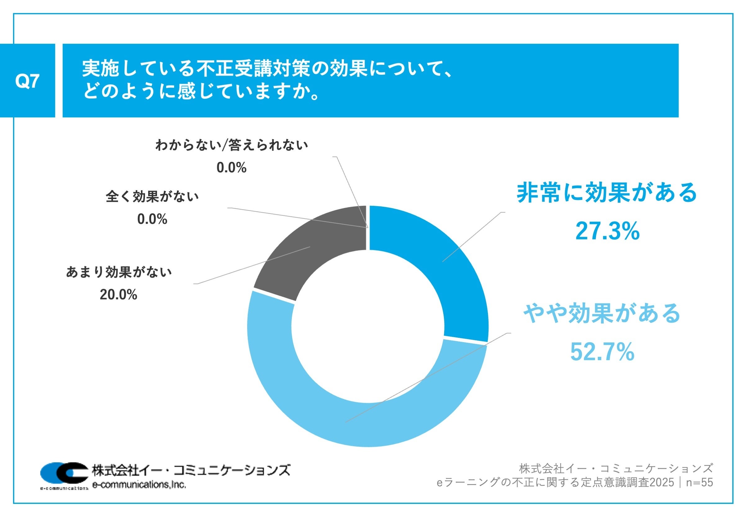 「【新規】Q7. Q5で「対策を実施している」と回答した方にお聞きします。実施している不正受講対策の効果について、どのように感じていますか。」(n=55)と質問したところ、「非常に効果がある」が27.3%、「やや効果がある」が52.7%という回答となりました。