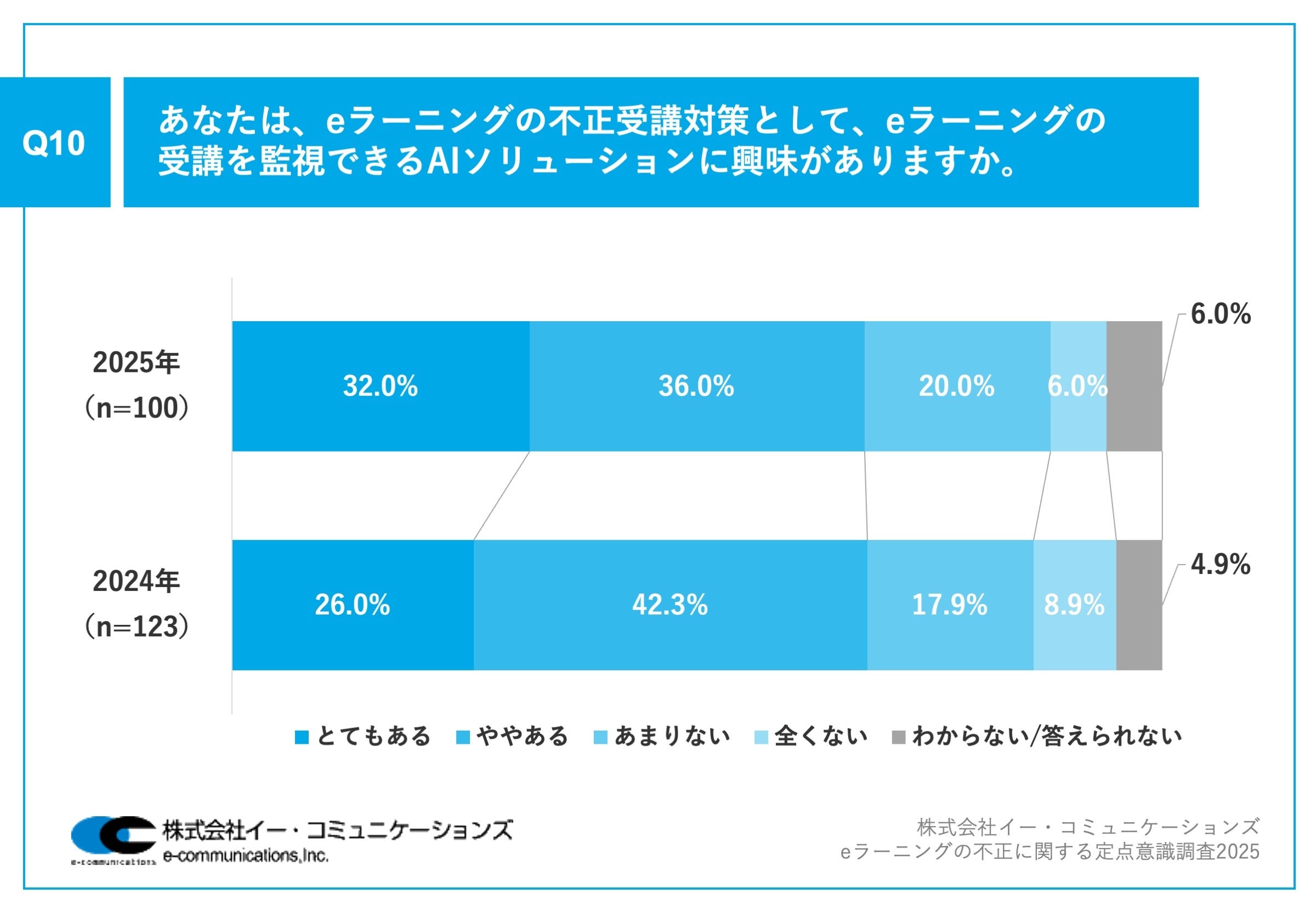 「【定点】Q10. あなたは、eラーニングの不正受講対策として、eラーニングの受講を監視できるAIソリューションに興味がありますか。」(n=100)と質問したところ、「とてもある」が32.0%、「ややある」が36.0%という回答となりました。