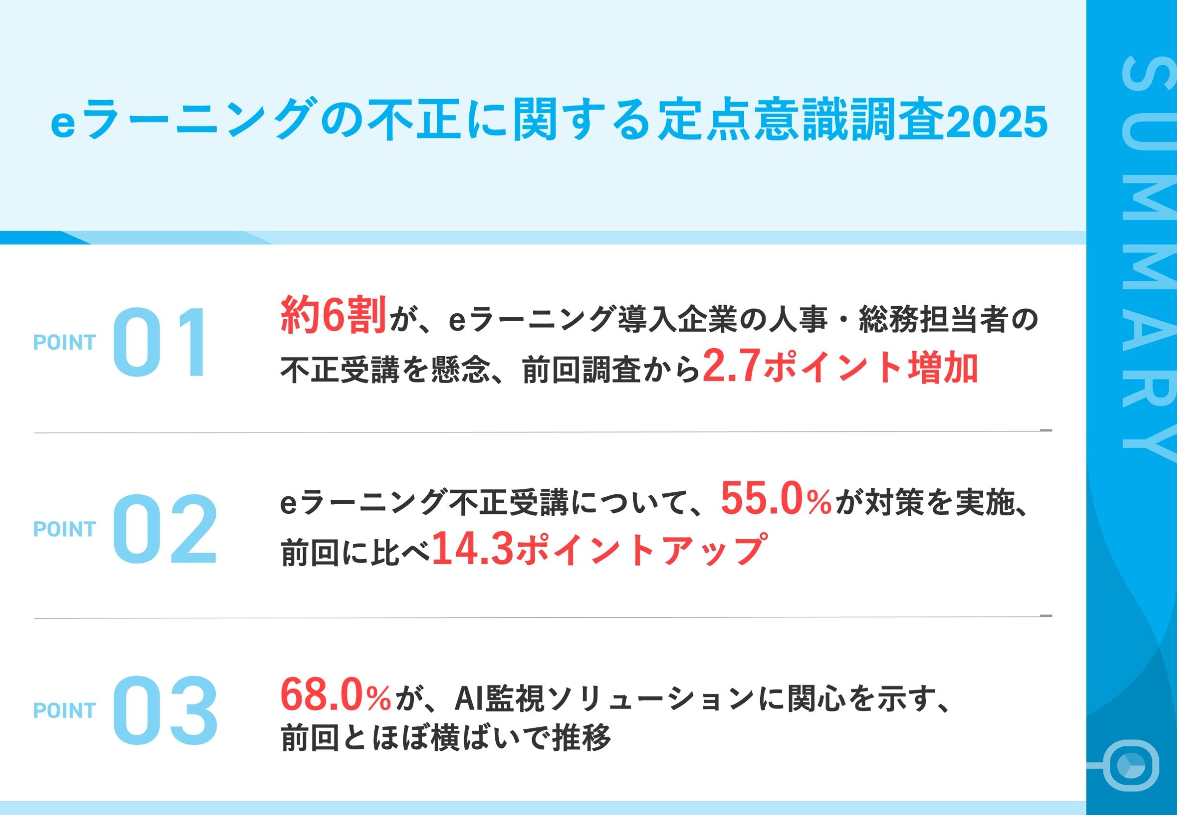 - 01|約6割が、eラーニング導入企業の人事・総務担当者の不正受講を懸念、前回調査から2.7ポイント増加- 02|eラーニング不正受講について、55.0%が対策を実施、前回に比べ14.3ポイントアップ- 03|68.0%が、AI監視ソリューションに関心を示す、前回とほぼ横ばいで推移