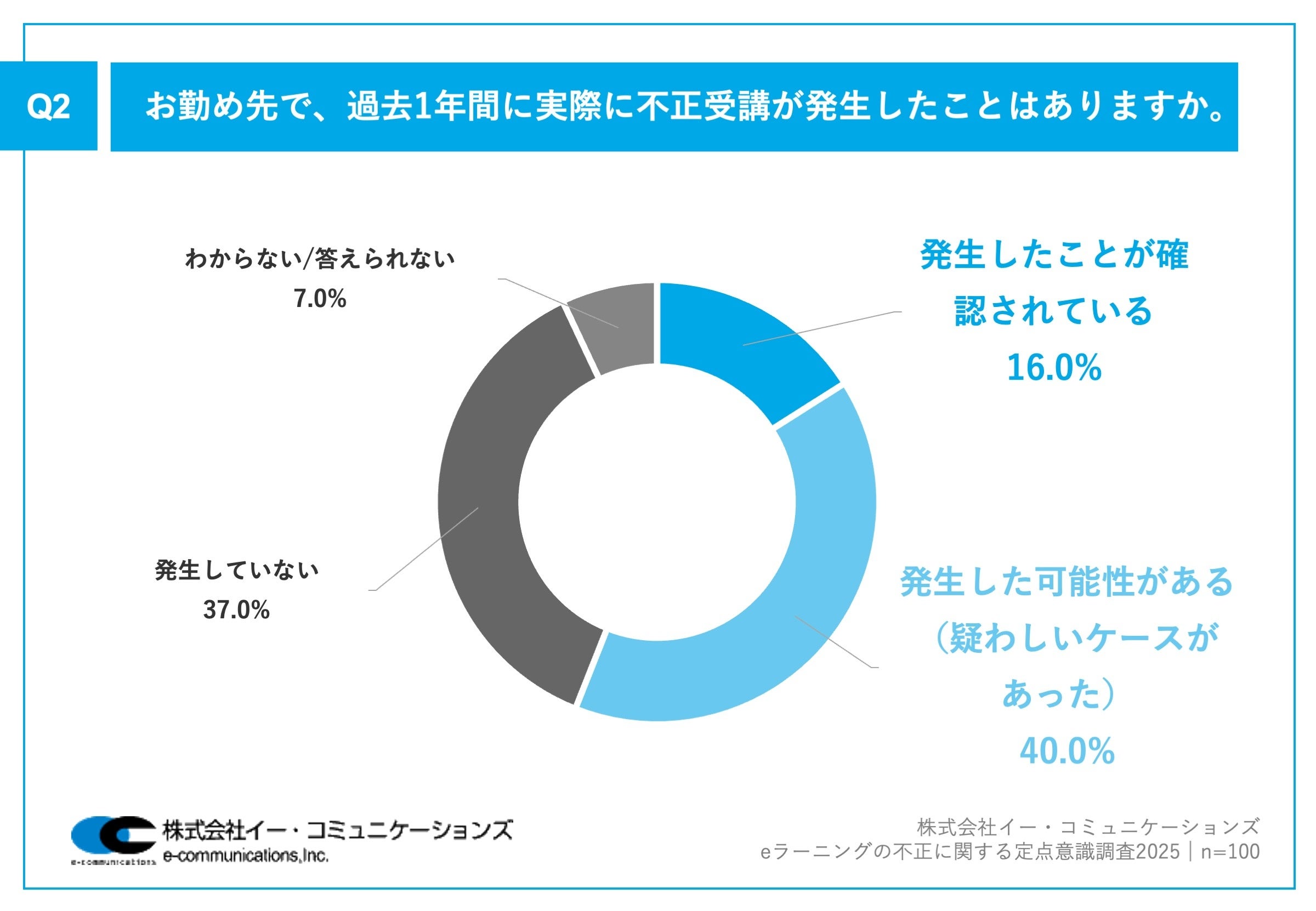 「【新規】Q2. お勤め先で、過去1年間に実際に不正受講が発生したことはありますか。」(n=100)と質問したところ、「発生したことが確認されている」が16.0%、「発生した可能性がある(疑わしいケースがあった)」が40.0%という回答となりました。
