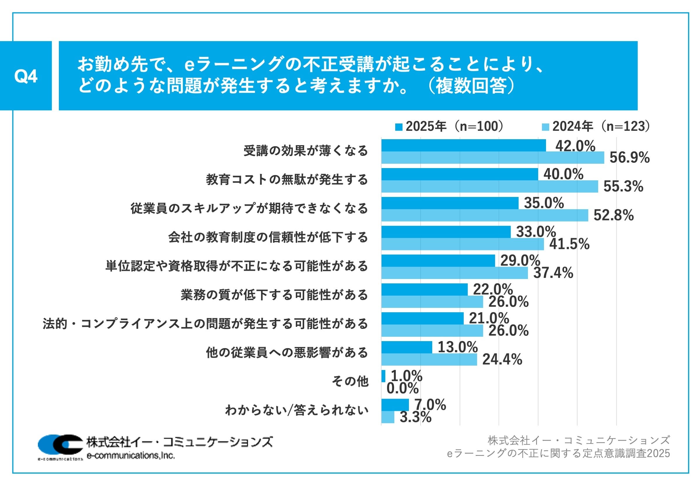 「【定点】Q4. お勤め先で、eラーニングの不正受講が起こることにより、どのような問題が発生すると考えますか。(複数回答)」(n=100)と質問したところ、「受講の効果が薄くなる」が42.0%、「教育コストの無駄が発生する」が40.0%、「従業員のスキルアップが期待できなくなる」が35.0%という回答となりました。