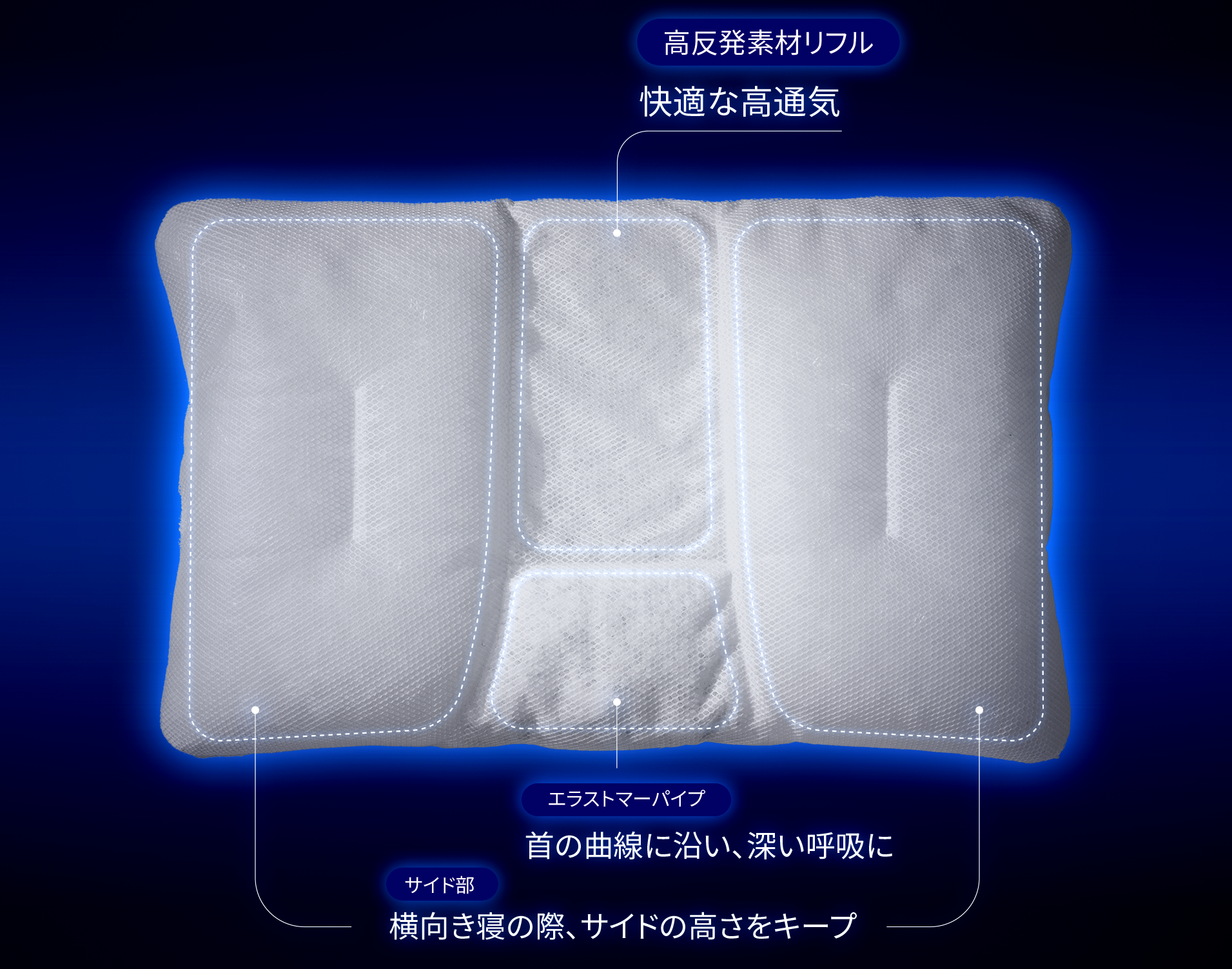 「深呼吸まくら O2」は、役割に合わせて、3つの異なる特長を持つ素材を配置しています。頭部分には通気性と耐久性に優れた独自素材『高反発網状素材リフル』を採用することでへたりにくく、蒸れを軽減します。首元には柔らかさと弾力性のある『エラストマーパイプ』を採用し、首の触感とフィット感を追求しています。その結果、頭と首への圧力負担は一般的な枕と比較して約8%軽減※4します。サイドには高通気で弾力性のある『ソフトパイプ』を採用し、あおむけ時の安定感と、横向き寝の際にも枕が沈み込みにくく、理想の寝姿勢を保てます。