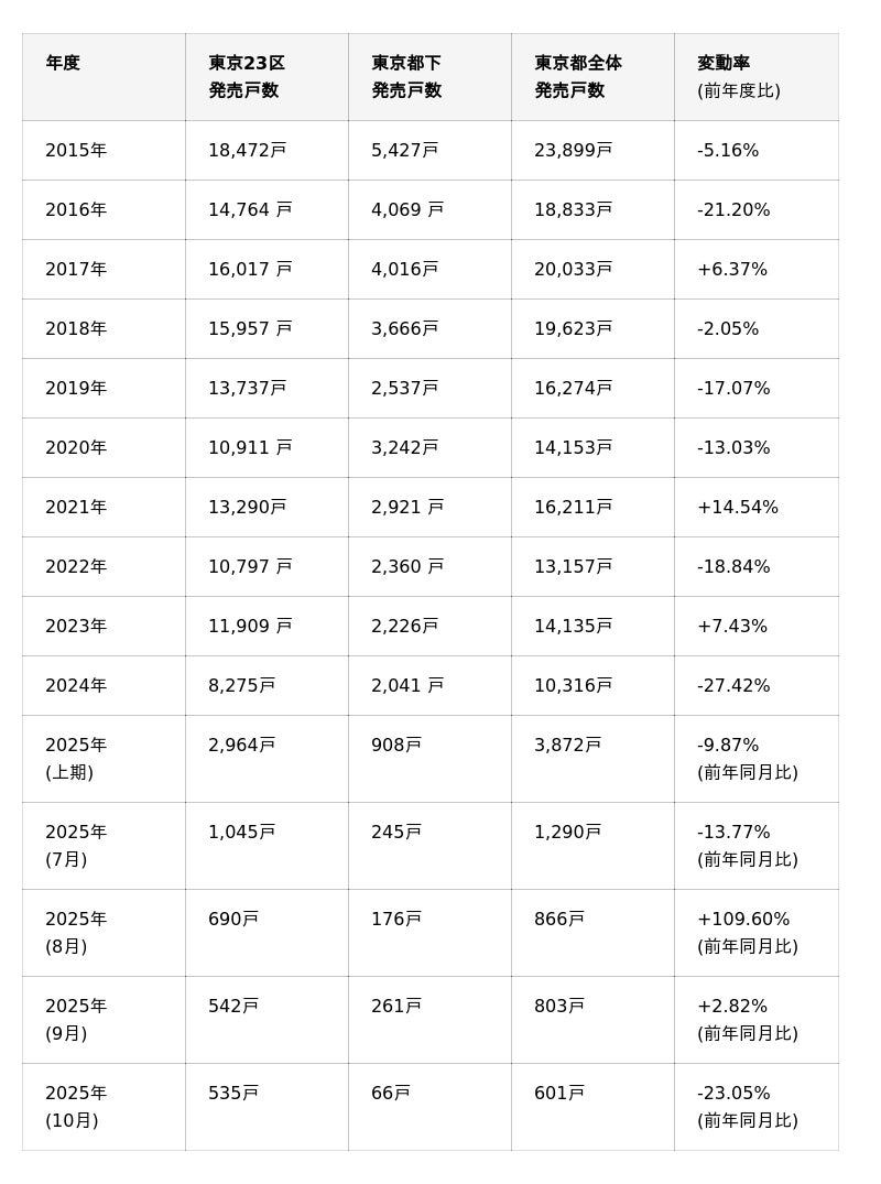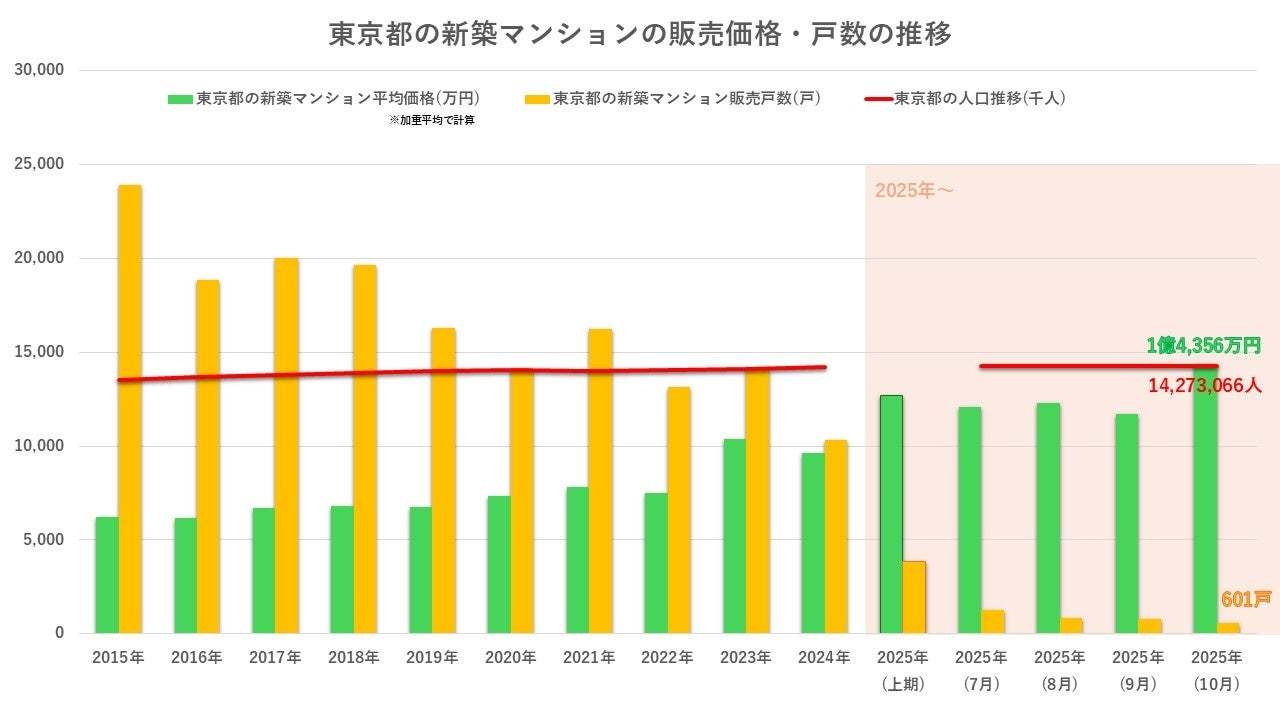 2015年~2025年までの東京都における 新築マンションの「価格・発売戸数・人口」 の推移を独自に集計・分析しました。