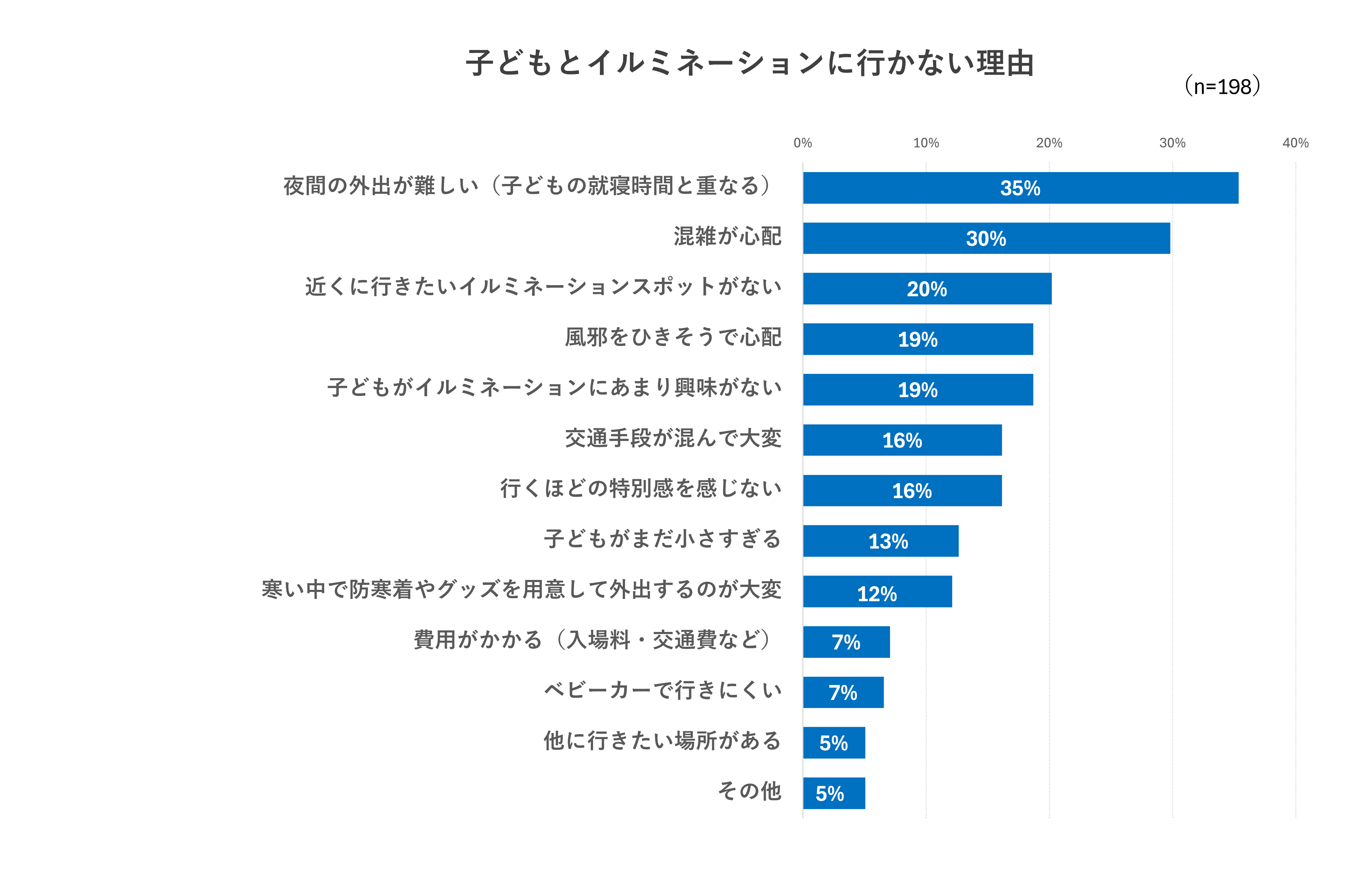 最も多かったのは「夜間の外出が難しい(子どもの就寝時間と重なる)」で35% でした。イルミネーションは暗くなってからが本番のイベント。そのため、小さな子どもがいる家庭では、