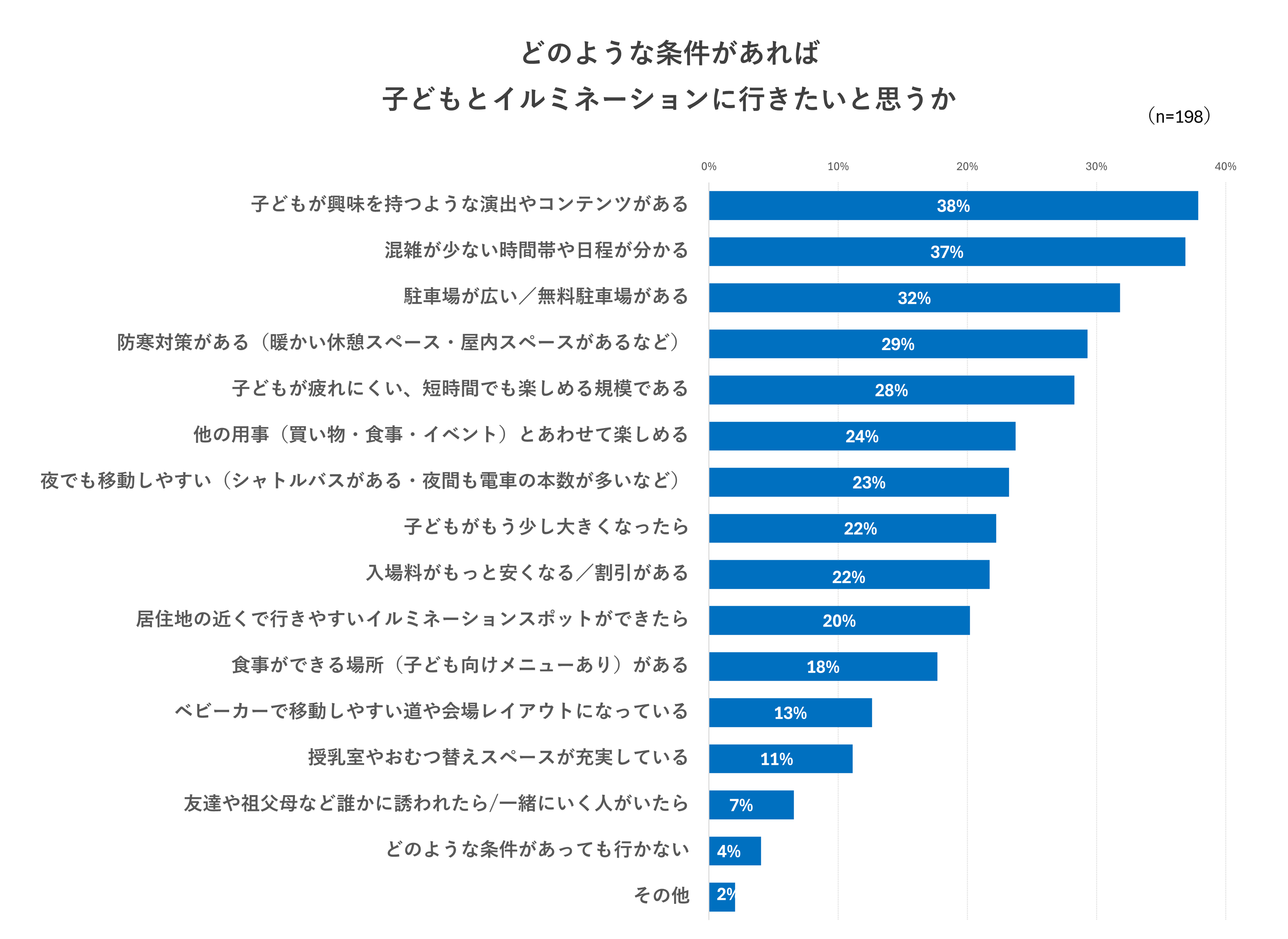 最も多かったのは 「子どもが興味を持つような演出やコンテンツがある(38%)」 でした。寒さで子どもがぐずる懸念もあるため、子ども自身が好奇心を刺激されたり、「楽しい」と思える要素があるかどうかが、行くかどうかを後押しする大きなポイントといえます。