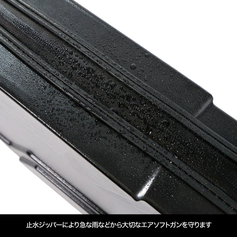 止水ジッパーは、サバゲーで避けられない突然の雨や地面の水はねからエアソフトガンを守るための重要な装備です。ジッパーの隙間から水が侵入しにくい構造になっているため、移動中に雨脚が強まったり、フィールド内で濡れた地面にケースを置いたりする場面でも安心して使用できます。特に、電動ガンや光学サイトなど水濡れに弱い装備を持ち運ぶユーザーにとって、止水ジッパーの採用は“大事な機材を守る最後の防壁”となります。
