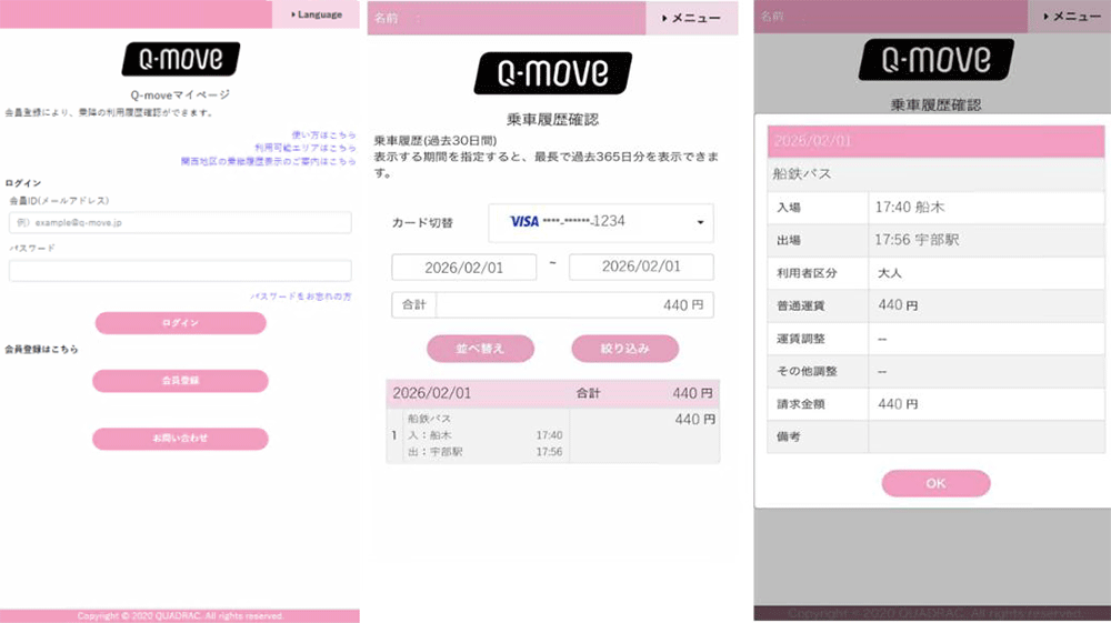 交通事業者向け決済及び認証のプラットフォームを提供するQUADRACのQ-moveサイト(