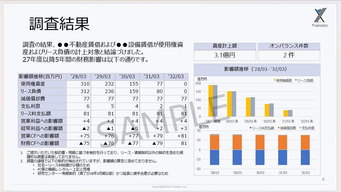 - フリーレント、変則支払対応- 延長オプションの有無の解析- 少額リースや短期リースの処理対応- 資産除去債務の計上- リースの一括計上