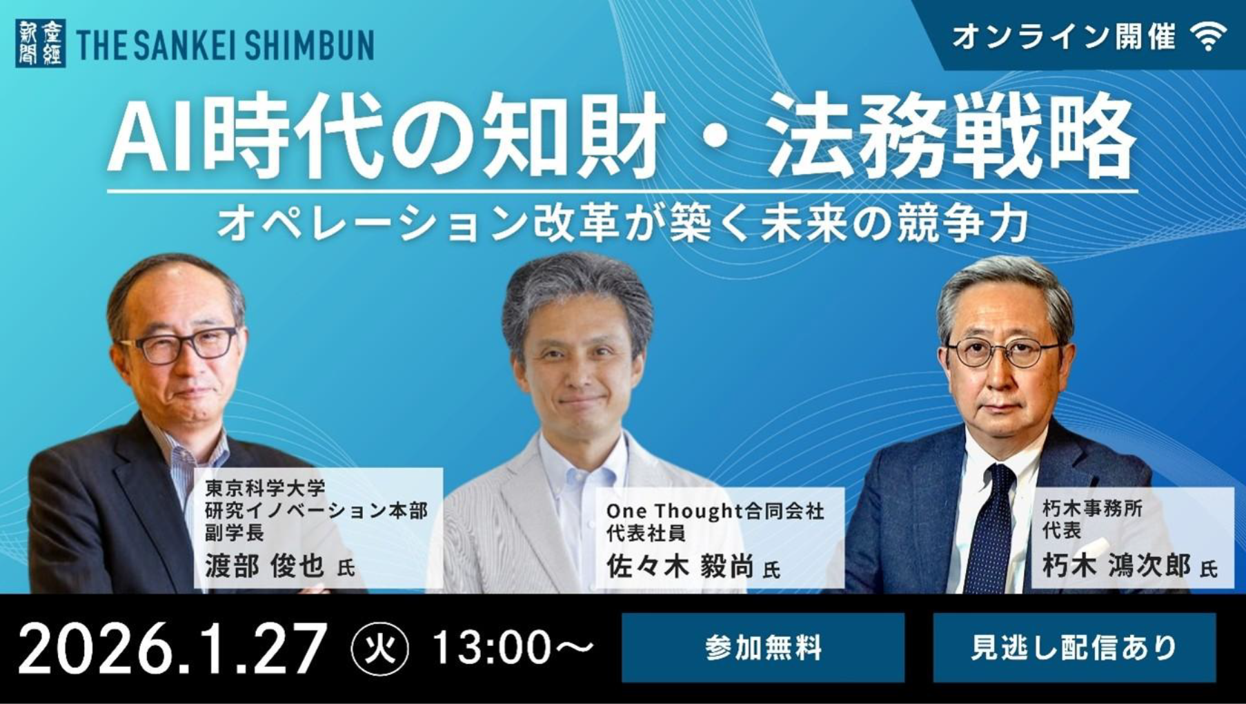 産経新聞社(東京都千代田区、社長・近藤哲司)は、セミナー「AI時代の知財・法務戦略 オペレーション改革が築く未来の競争力」を、2026年1月27日(火)13時からオンラインで開催。参加者を募集します。