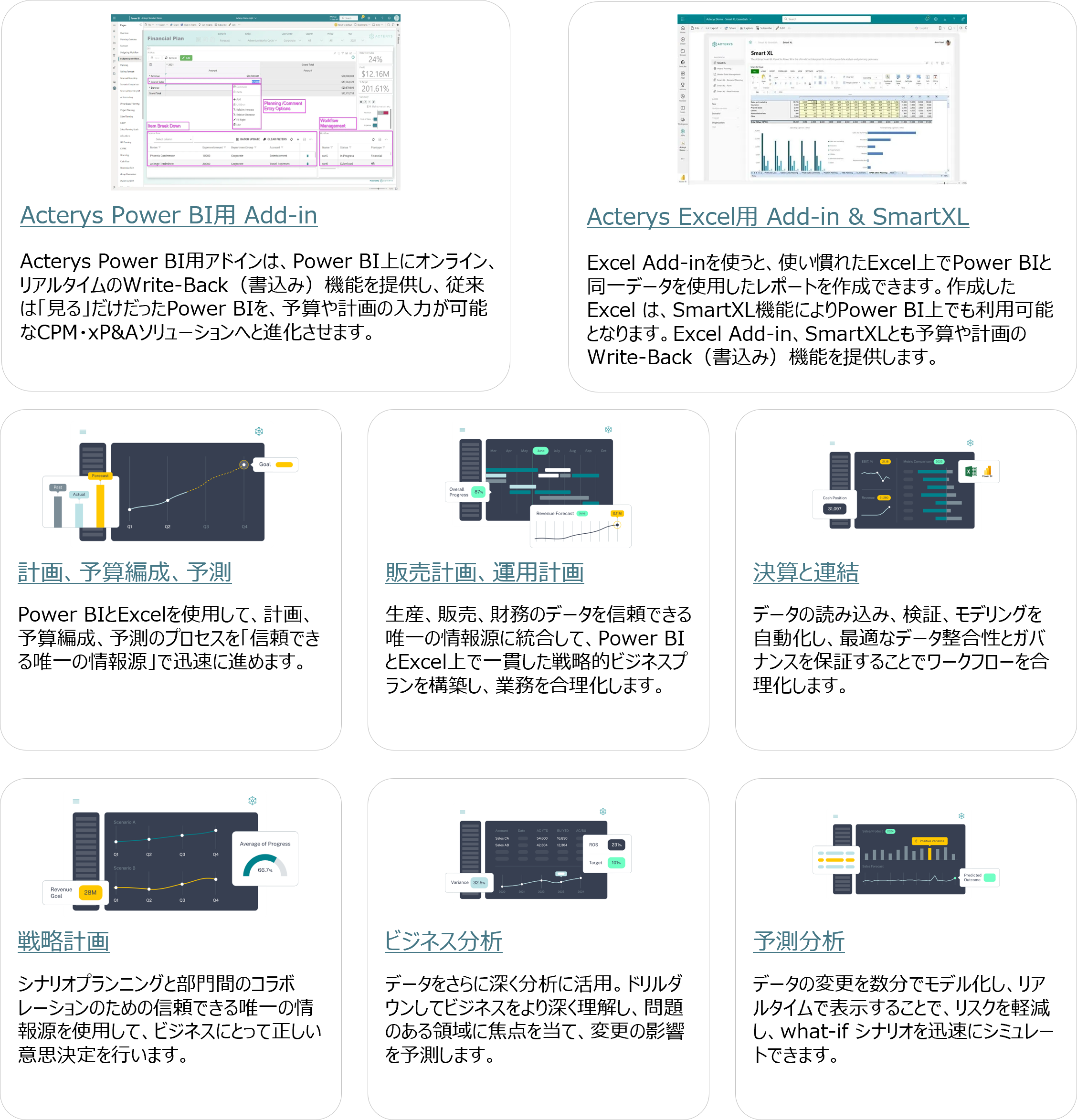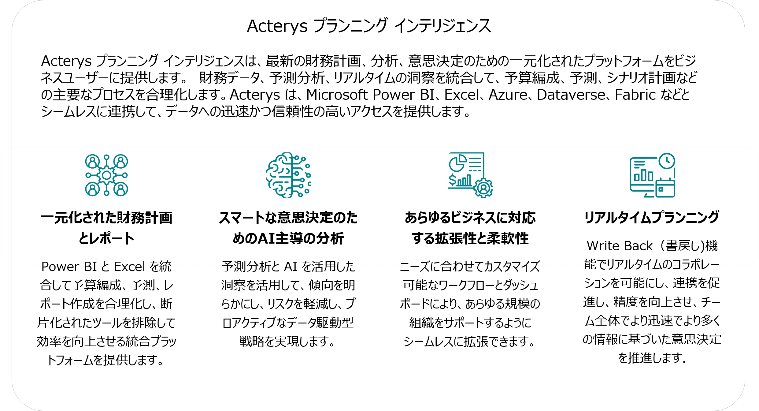 Acterysは、Microsoft FabricとPower BIに強力かつリアルタイム・シームレスなWrite-Back(書き込み)機能とワークフロー機能拡張を追加することで、従来は「見る」だけだったBIツールを、予算編成や経営計画などの入力・編集が可能でAIとの親和性も高いCPM(Corporate Performance Management)・xP&A(Extended Planning & Analytics)ソリューションへと進化させます。
