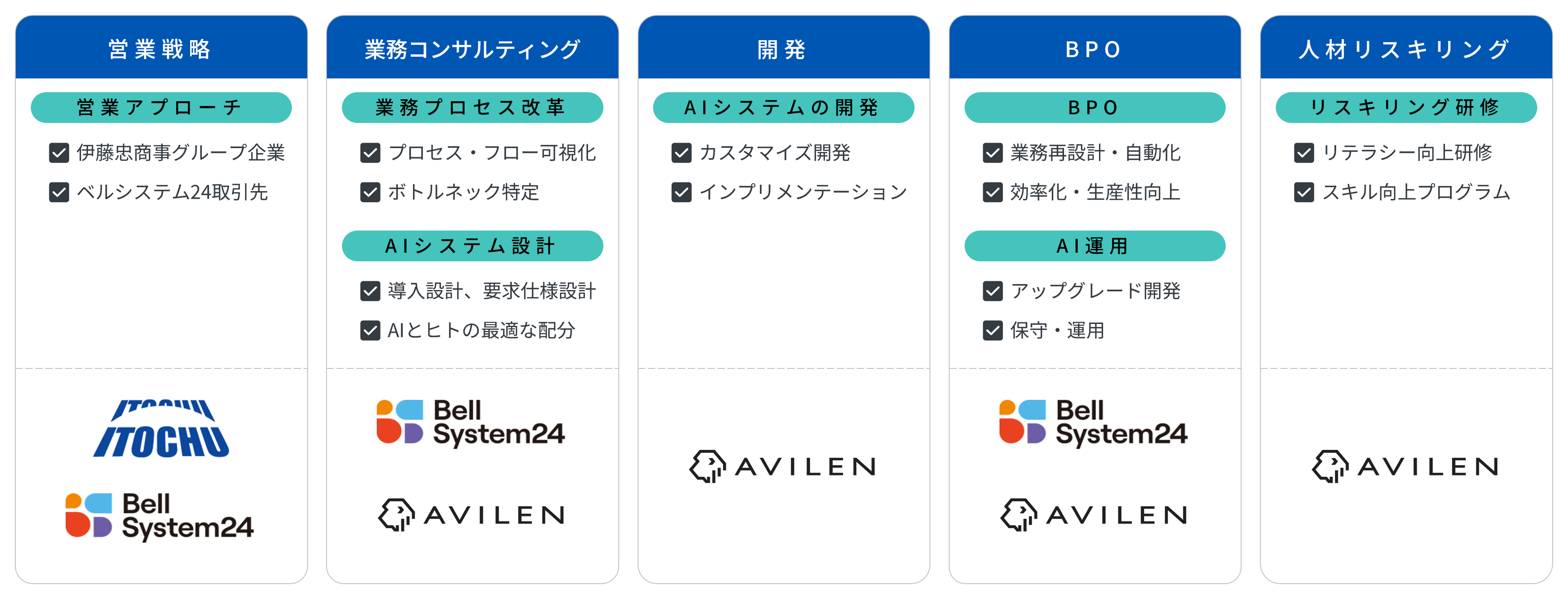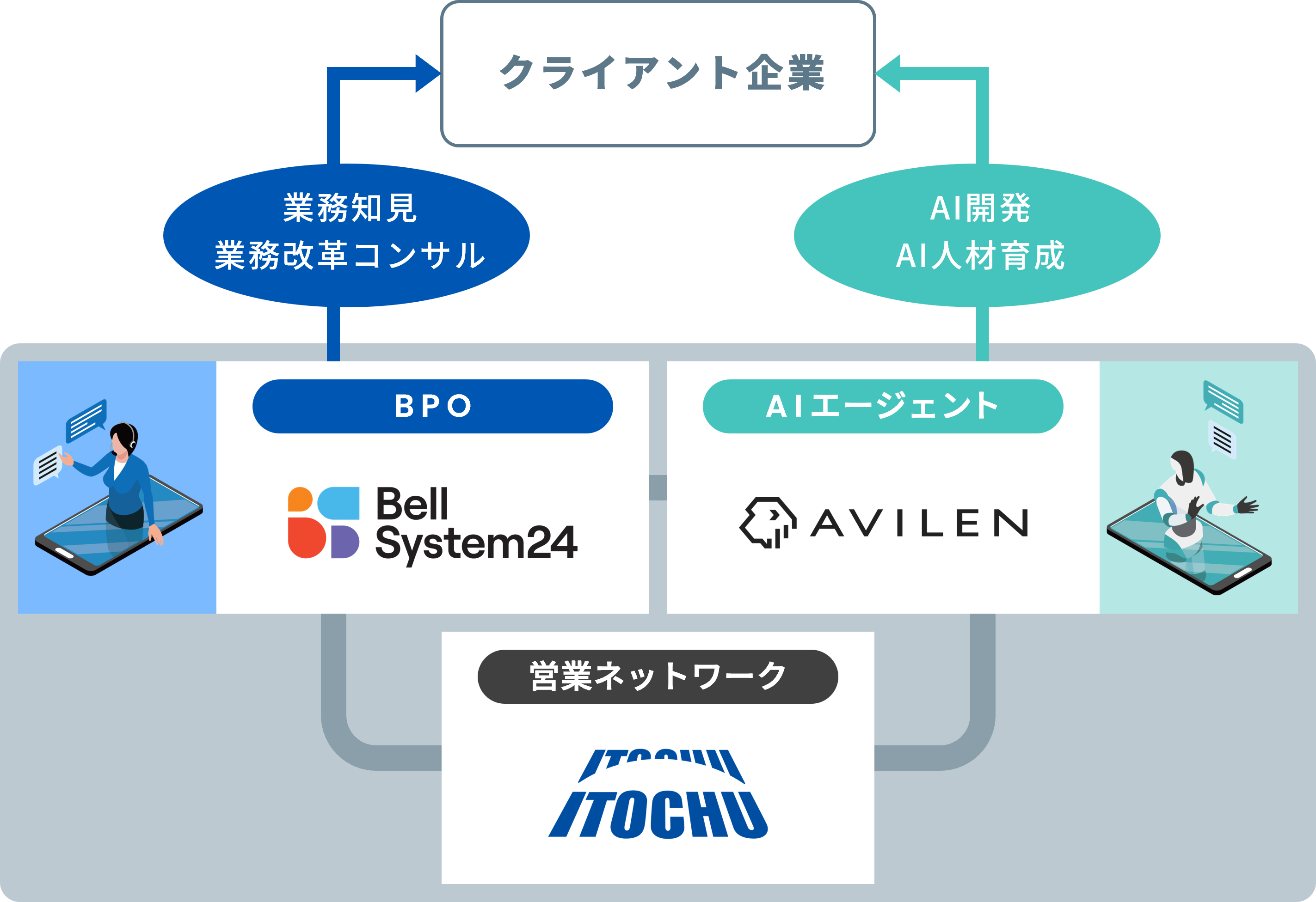 株式会社ベルシステム24(本社:東京都港区、代表取締役 社長執行役員:梶原 浩、以下:当社)は、株式会社AVILEN(本社:東京都中央区、代表取締役:高橋 光太郎、以下:AVILEN)および伊藤忠商事株式会社(本社:東京都港区、代表取締役社長COO:石井 敬太、以下:伊藤忠商事)と業務提携契約(以下:本提携)を締結し、AIエージェントのオーダーメイド開発や実装、AI人材へのリスキリング、BPOを包括的に支援するソリューションを提供開始します。これにより、AIソリューションの導入や業務プロセスの断片的な支援に留まらない、企業ごとの業務プロセスや課題に応じた支援が可能になります。
