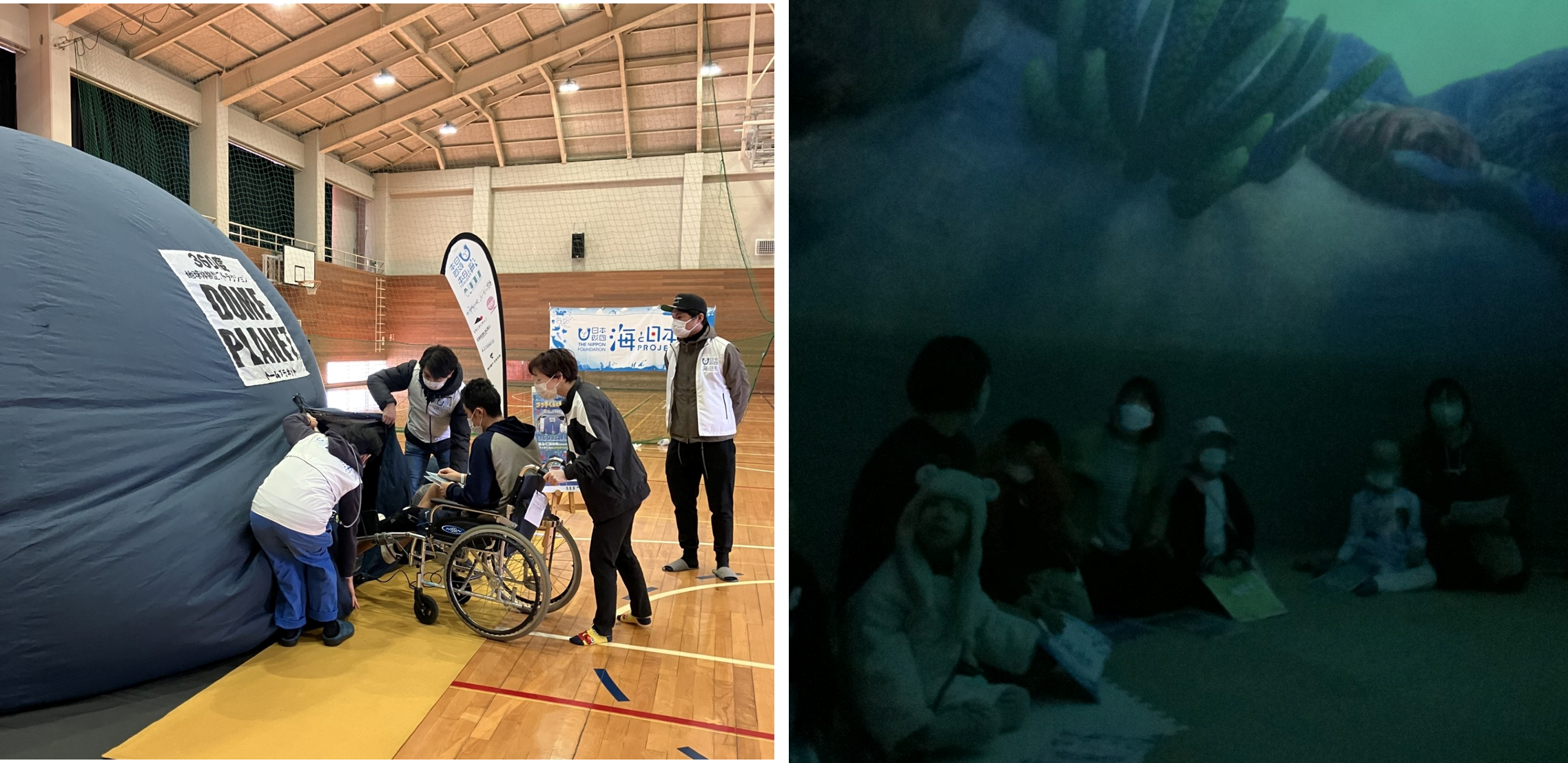エアドーム内では、360度見渡す限りの海の世界が広がり、ナビゲーターのジンベエザメ「ブッチくん」が登場。ブッチくんが参加してくれた子どもの名前を呼ぶと、子どもたちは驚きの表情をしていました。その後は、ブッチくんとリアルタイムで会話をしながら、魚の種類や地球温暖化などの海の問題、地元・島根の海に関するクイズに元気いっぱいに答え、子どもたちはブッチくんの話や映像に食い入るように見入り、海の問題を「自分ごと」として捉える真剣な眼差しが印象的でした。