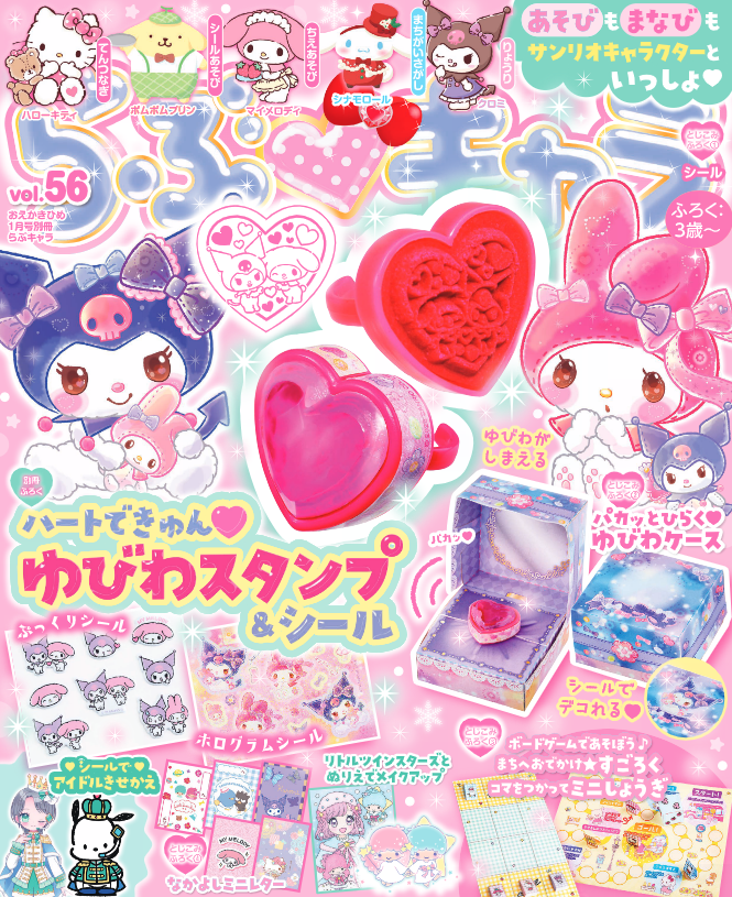 マイメロディ&クロミの大きなハートジュエル付き「ゆびわスタンプ」+ホログラム&ぷっくりシール2枚が付録!『らぶキャラvol.56』発売