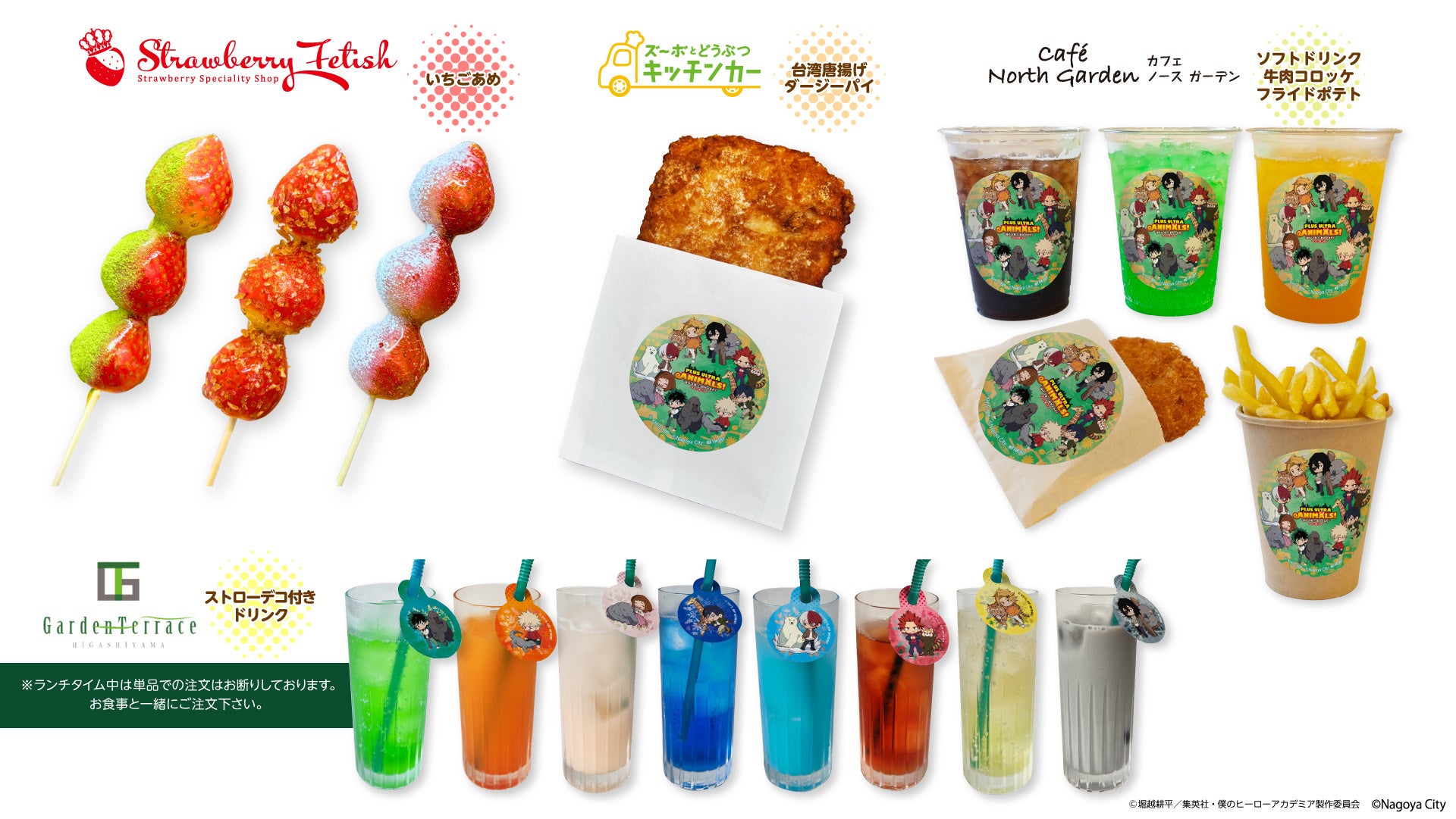 - 緑谷のメロンソーダ/770円(税込)- 爆豪のオレンジ&ベリードリンク/770円(税込)- 麗日のピーチ&ホワイトウォーター/770円(税込)- 飯田のブルーソーダ/770円(税込)- 轟のブルーホワイトソーダ/770円(税込)- 切島のピーチ&ベリーウーロン/770円(税込)- 上鳴のジンジャーソーダ/770円(税込)- 相澤の黒ゴマ豆乳ドリンク/770円(税込)
