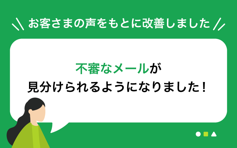 お客さまより、「不審なメールが多く、三井住友カードから送られたメールかどうか見分けがつかない」というお声をいただいておりました。弊社からお送りするメールの宛名には、お客さまご自身で設定いただいたハンドルネームを記載しておりますので、宛名を確認いただくことで弊社からのメールであることを判断していただくことができます。