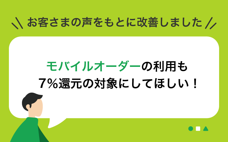 弊社では、「対象のコンビニ・飲食店で7%還元!」サービス※を提供しています。従来は対象の三井住友カードのスマホのタッチ決済を使用することで7%還元の対象としておりましたが、「モバイルオーダーも対象としてほしい」とのお声を多くいただいておりました。