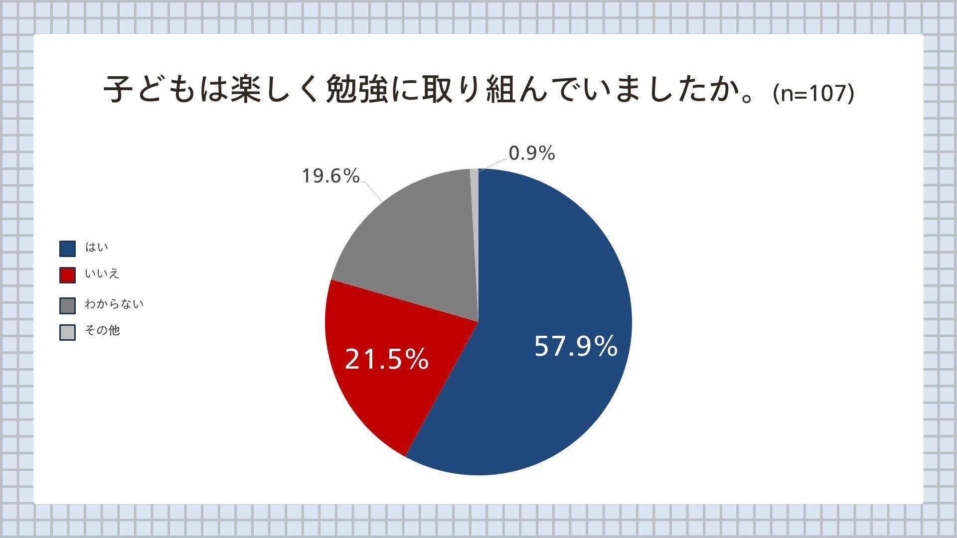 今回の調査では、57.9%の保護者が「子どもは楽しく勉強に取り組んでいた」と回答。学習に前向きに取り組む子どもが多いという傾向が見られました。