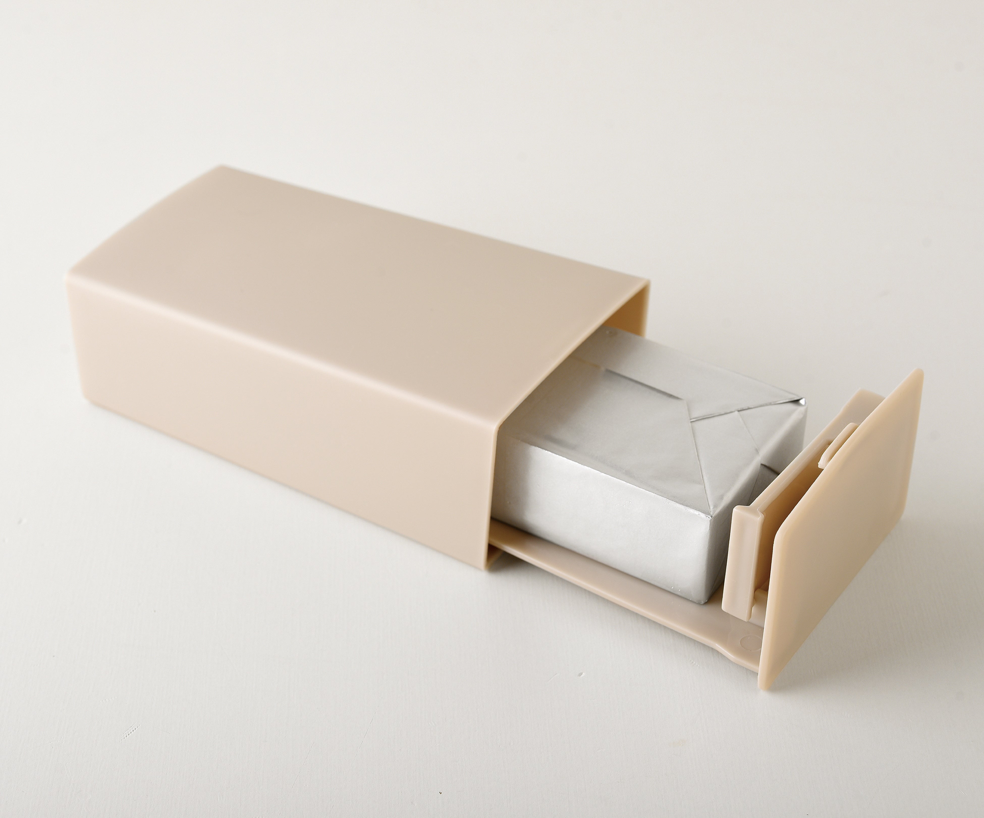 専用のカッターが付属しており、ガイドに合わせることで、200gのバターは約10g/5g、150gのバターは約8g/4gの目安で切り分けることができます。また、刃先が斜めになっているので、切ったバターの刃離れが良いことも特徴です。カッターはケース内に収納することができます。