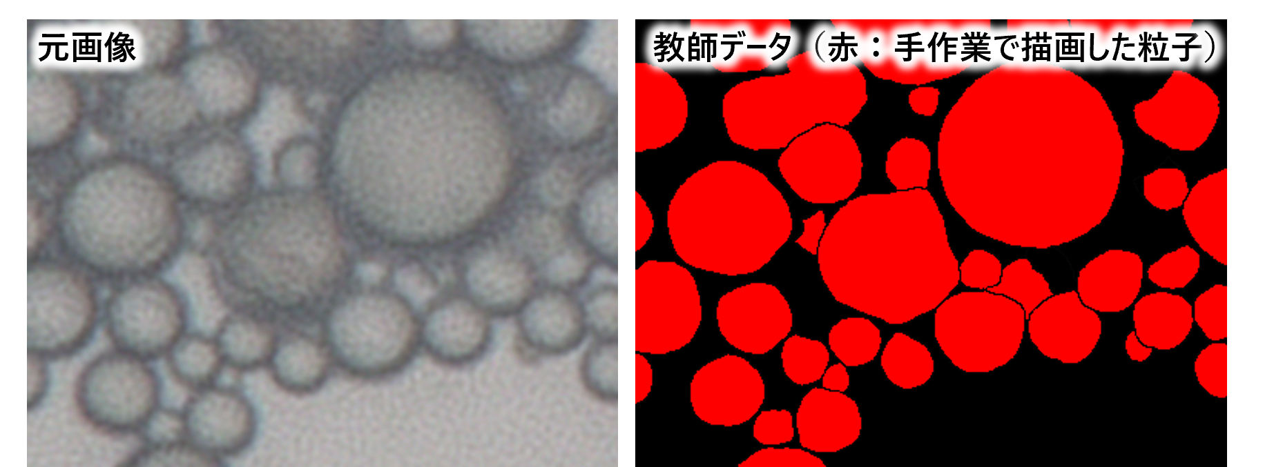 ディープラーニングによる検査自動化には、ベテラン検査員の判断をAIに学ばせるための「教師データ(正解データ)」が不可欠です。教師データは、AIに読み込ませるためのデータで、わずかな誤りがあるだけでも解析精度が大きく低下するため、ピクセルレベルで正確に作成する必要があります。教師データ作成は、画像中の粒子を一つずつ手作業で色分けするなどして行います。この作業は高度な集中力と正確さを求められるとともに、膨大な作業量のため人手不足が課題となっていました。