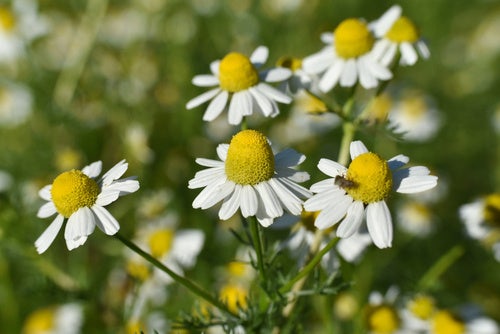 カマズレンは、特にジャーマンカモミールから抽出されたものが有名。白い花びらのジャーマンカモミールは、精油は濃い青色のため別名ブルーカモミールとも呼ばれます。