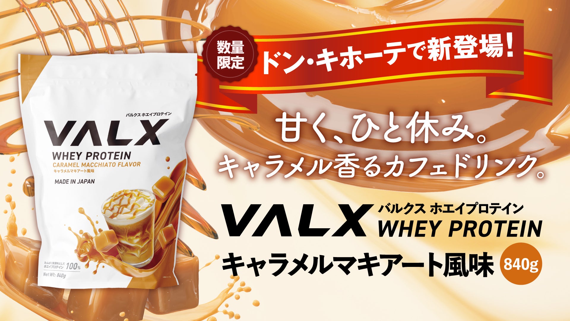 フィットネスブランド「VALX(バルクス)」を展開するVALX株式会社(本社:東京都渋谷区、代表取締役:只石昌幸、以下VALX)は、「VALX ホエイプロテイン キャラメルマキアート風味 840g」を、全国のドン・キホーテ系列店舗(一部店舗を除く)にて、数量限定で順次販売開始することをお知らせいたします。