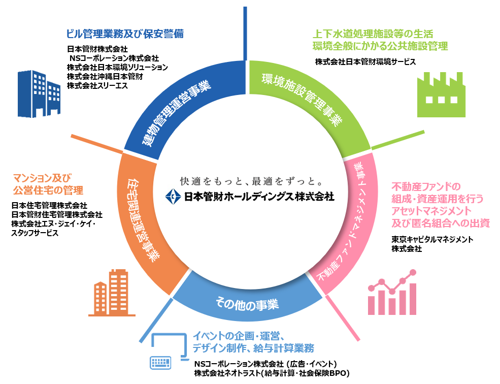事業内容:オフィスビル、集合住宅、環境施設等の管理運営事業や不動産ファンドマネジメント事業等を営むグループ会社の経営管理及びこれに附帯又は関連する業務
