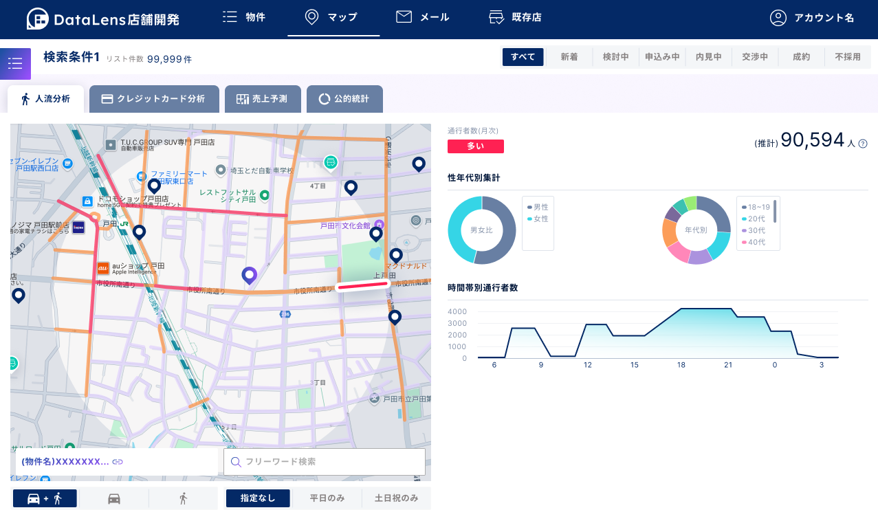 飲食店やフィットネススタジオ等の店舗ビジネス事業者や不動産ディベロッパー向けの商圏分析サービスです。人流データや決済データ等の複数の3rdパーティデータを活用して商圏内の消費者ニーズの「今」を捉えます。