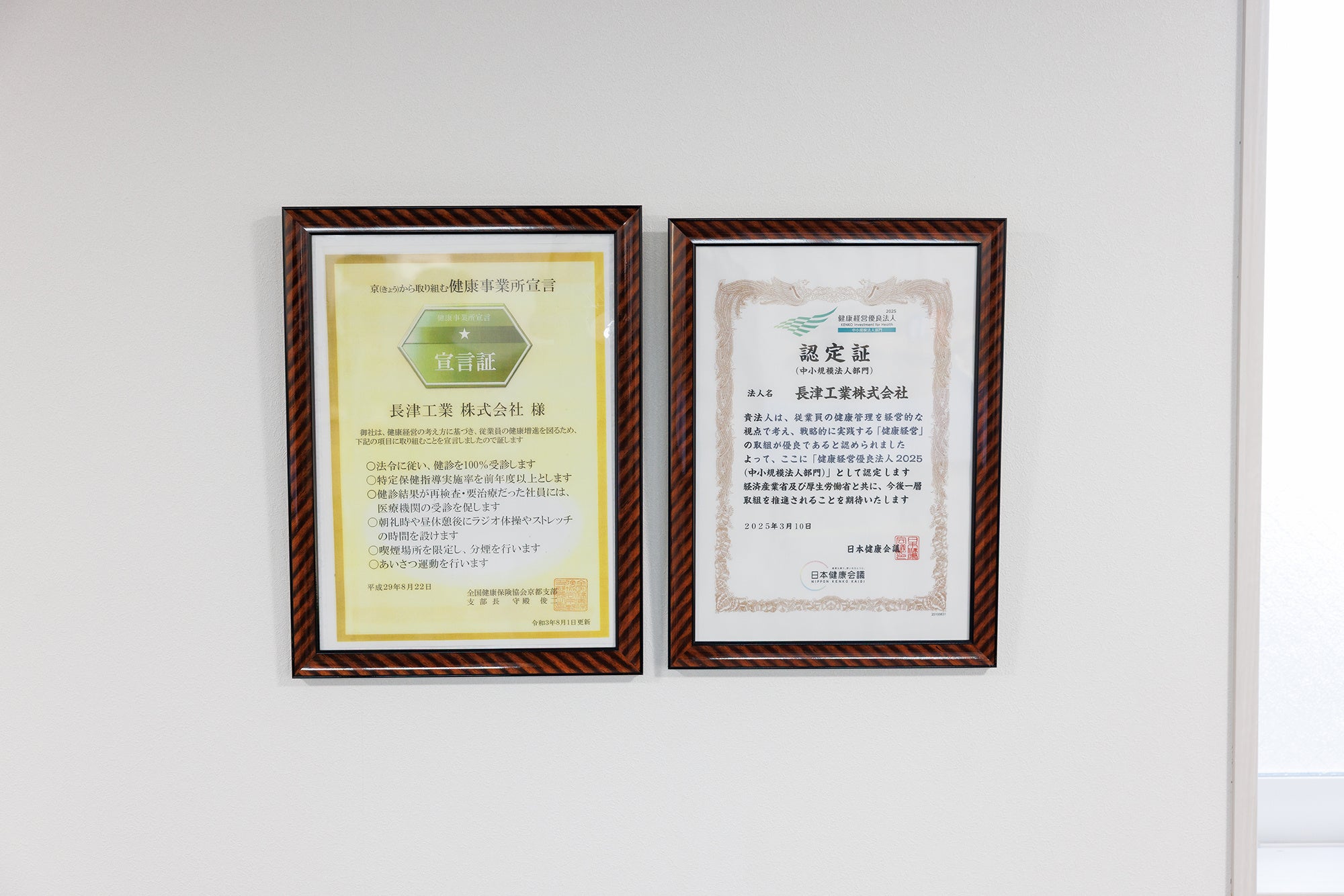 (左)健康事業所宣言 宣言証、(右)健康経営優良法人認定証