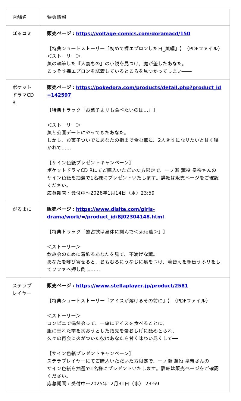 いずれの作品も特典としてぼるコミ限定の描きおろしショートストーリーをご用意しておりますので、シチュエーションボイスドラマと合わせてお楽しみください。
