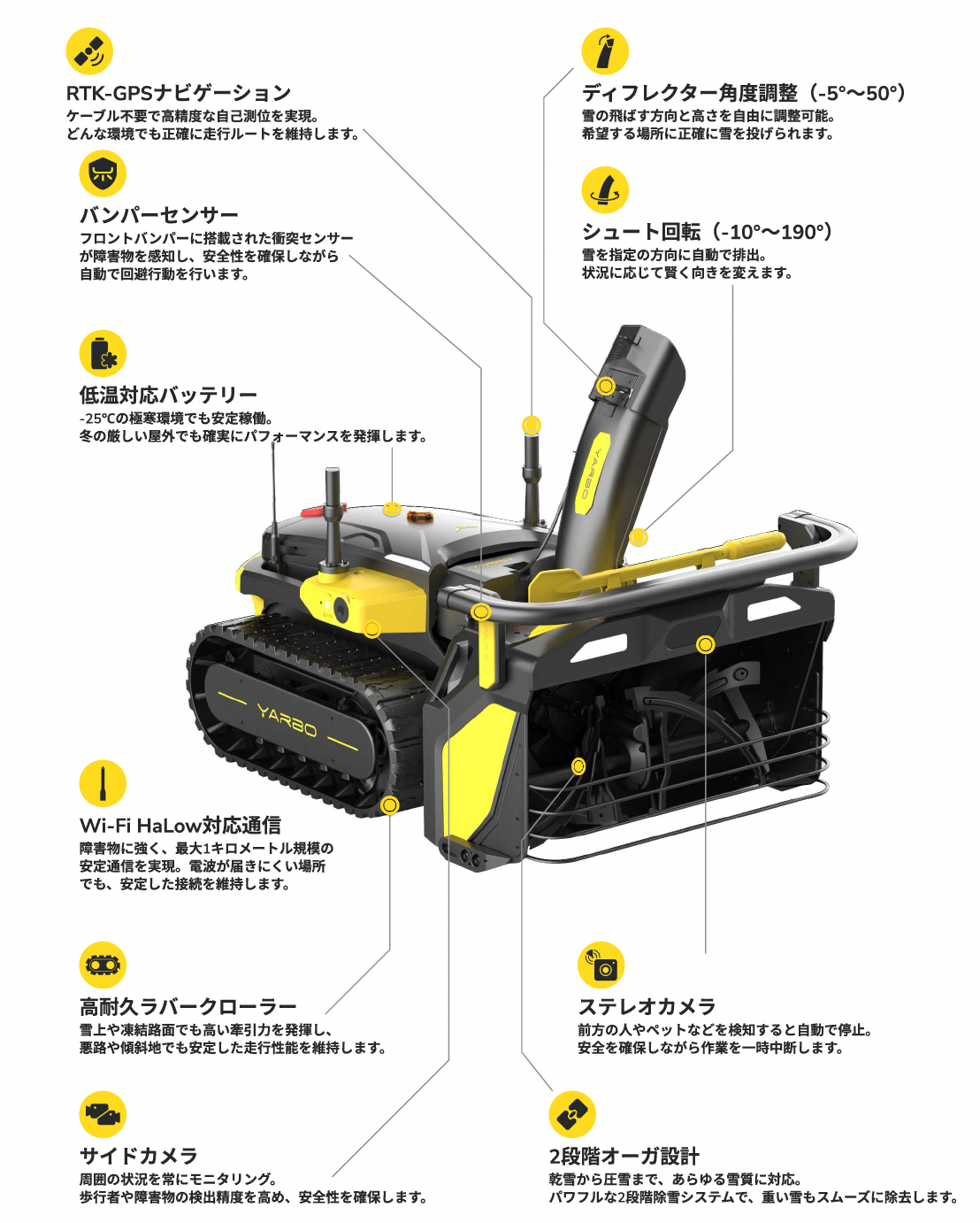 本実証試験では、米国で1万台以上の納入実績を持つ除雪ロボット「Yarbo」を使用し、積雪下での走行性能・投雪能力・運用性を評価します。Yarboは2025年12月より国内販売が開始され、電波法など必要な認可を取得した正式モデルを用いた試験となります。