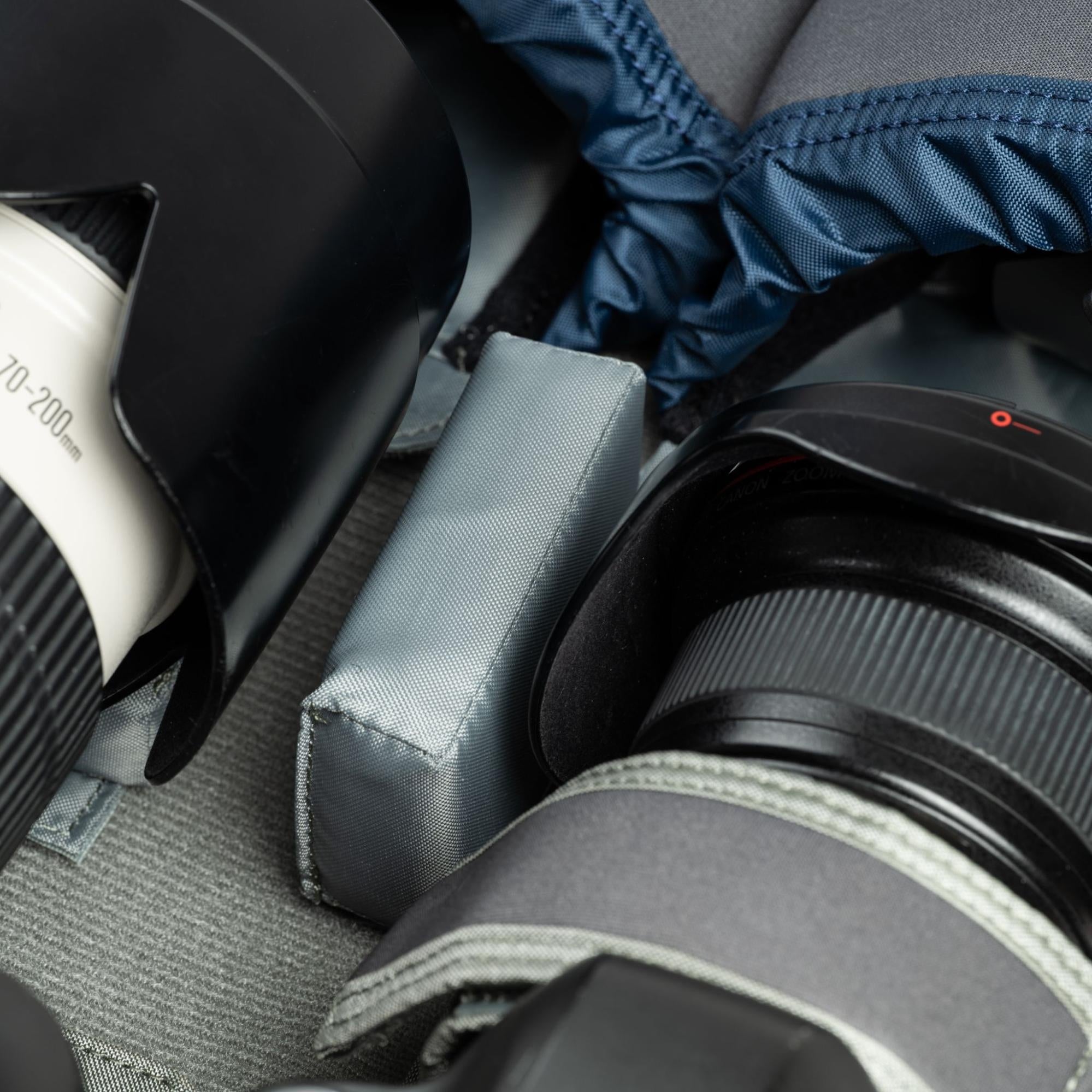 素早くアクセスできるフロントサイドポケットは、バッグ前面に左右一つずつ設けられ、最大70-200mm F2.8のレンズを収納可能。ポケットは大きく開くため、迅速なレンズ交換ができます。また、面ファスナーで取り付けられるディバイダーも装備。