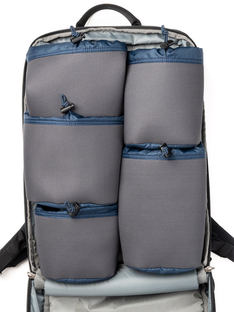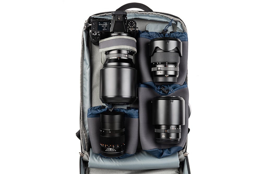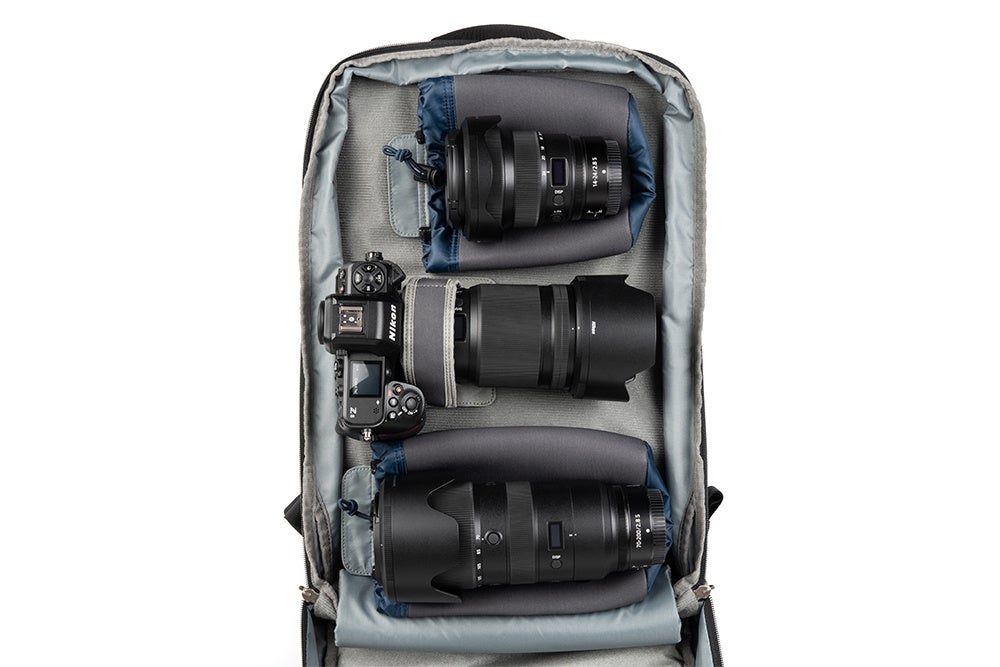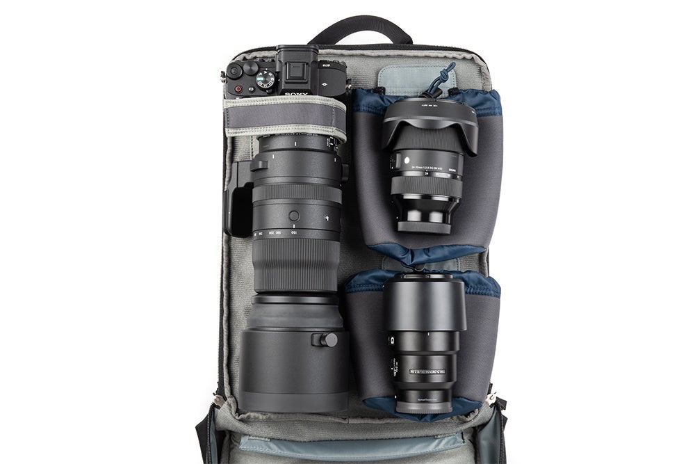 メインコンパートメントはディバイダーを用いず、付属のポーチや固定用ストラップ、機材の緩衝防止用のパッドを使用し、独自の機材レイアウトが可能。ボディやレンズ単体はもちろん、レンズを装着したカメラを収納できる設計で、柔軟で合理的なパッキングができます。