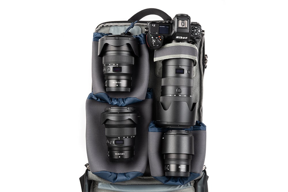 70-200mm F2.8レンズまで収納可能なフロントポケットや、レンズ装着カメラを複数収納できるメインコンパートメントなど、優れた収納設計を実現しています。