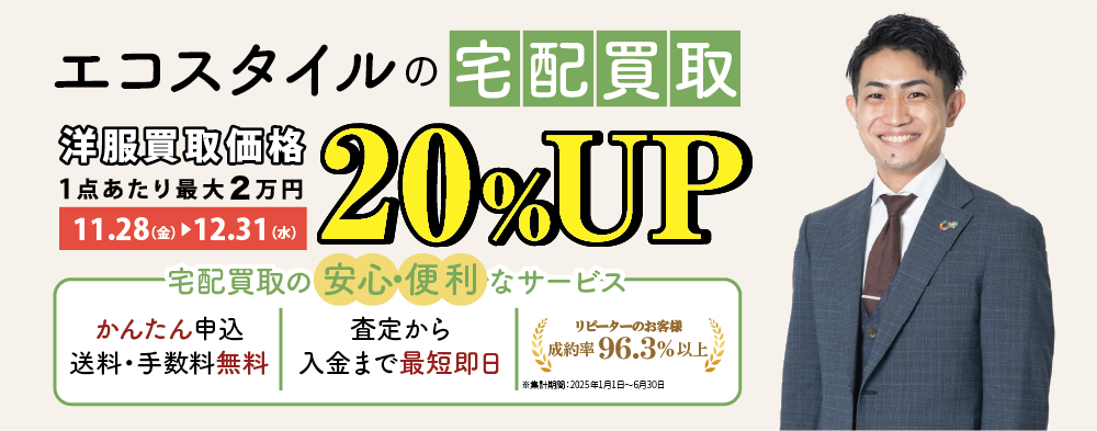 株式会社スタンディングポイント(東京都目黒区、代表取締役:若森 寛)は、運営するブランド買取サービス「エコスタイル(ECOSTYLE)」において、宅配買取限定の洋服買取金額20%UPキャンペーンを2025年11月28日~12月31日(水)まで実施します。