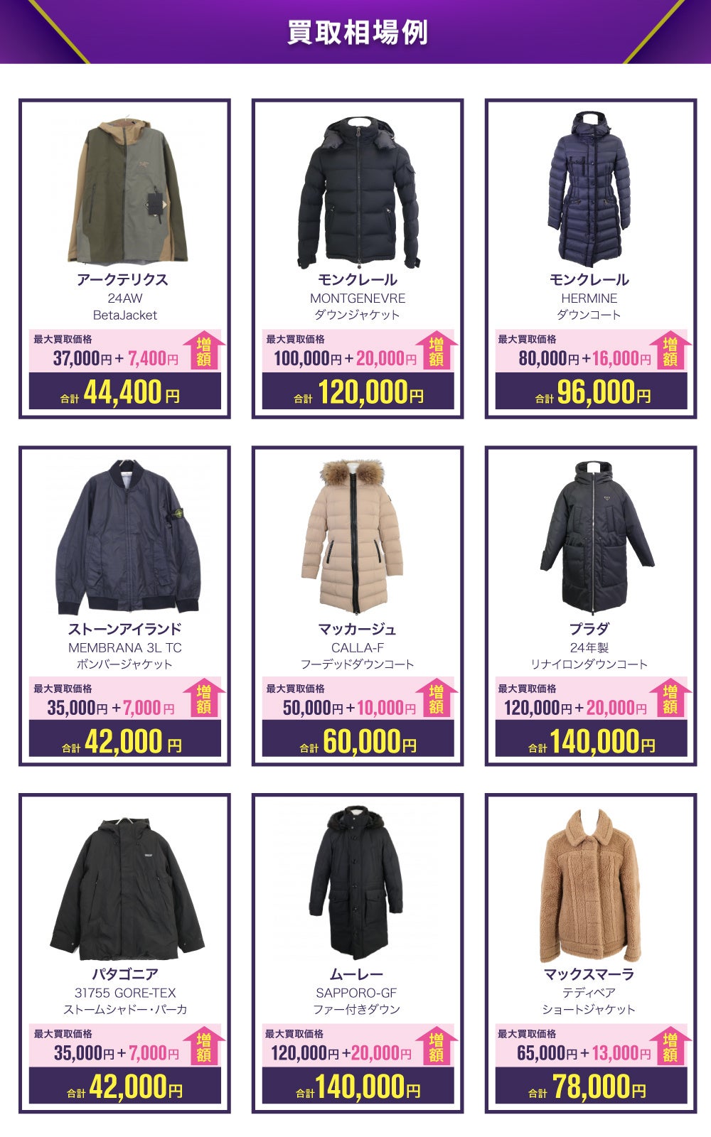 アウター・トップス・ボトムスなど幅広いアイテムが対象となり、査定金額1点ごとに20%が加算されます。