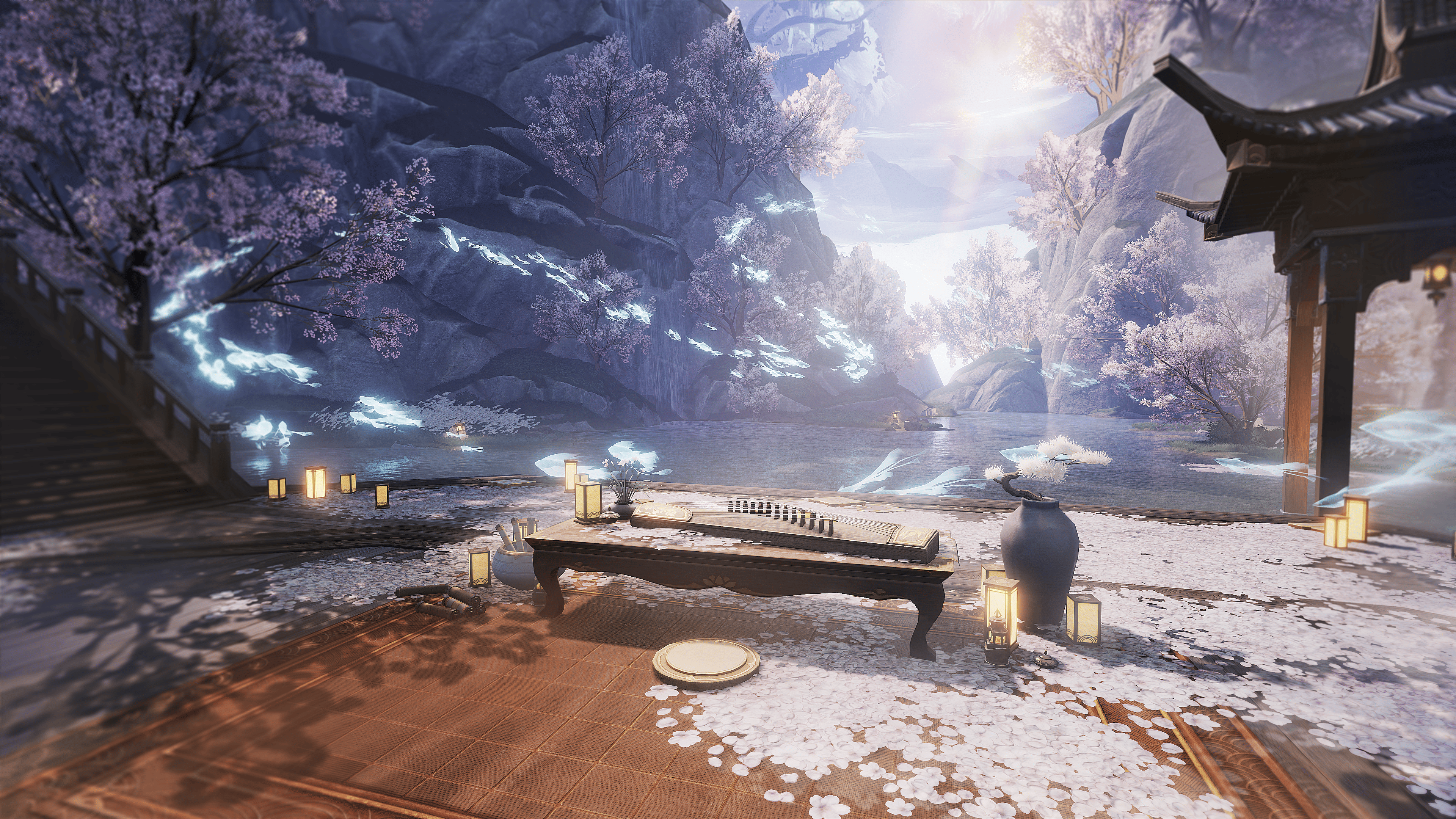 今回の物語の主軸となる新エリア「華胥」は、リリースバージョンで公開された「アイスレイク城」とは全く異なる、アジアンテイストで写実的な風景と幻想的な要素が融合した広大な地域です。華胥の南部に位置する「煙津渡(えんしんと)」や煙津渡の大型商会「百年春(ももとせ)」、医療所「枯栄閣」など、多彩な文化と趣を持つ新ステージが続々登場。
