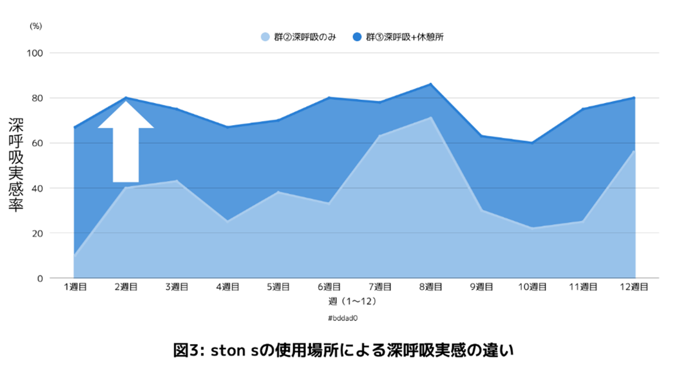深い呼吸の習慣化サポートデバイス「ston s(ストンエス)」の利用者アンケート結果を基に分析を行ったところ、ston s使用時の「呼吸が深くなった」と感じる実感率には、使用環境により違いがみられました。ston sを使用した深呼吸を業務実施場所ではなく休憩所で実施している利用者では、業務実施場所で深呼吸をしている利用者よりも、今回の分析対象期間(12週間)において、常に高い実感率を示していました。ston sを活用した深呼吸においては、「使用する場所・環境」も効果実感に関わる重要な要素の一つと考えられます。
