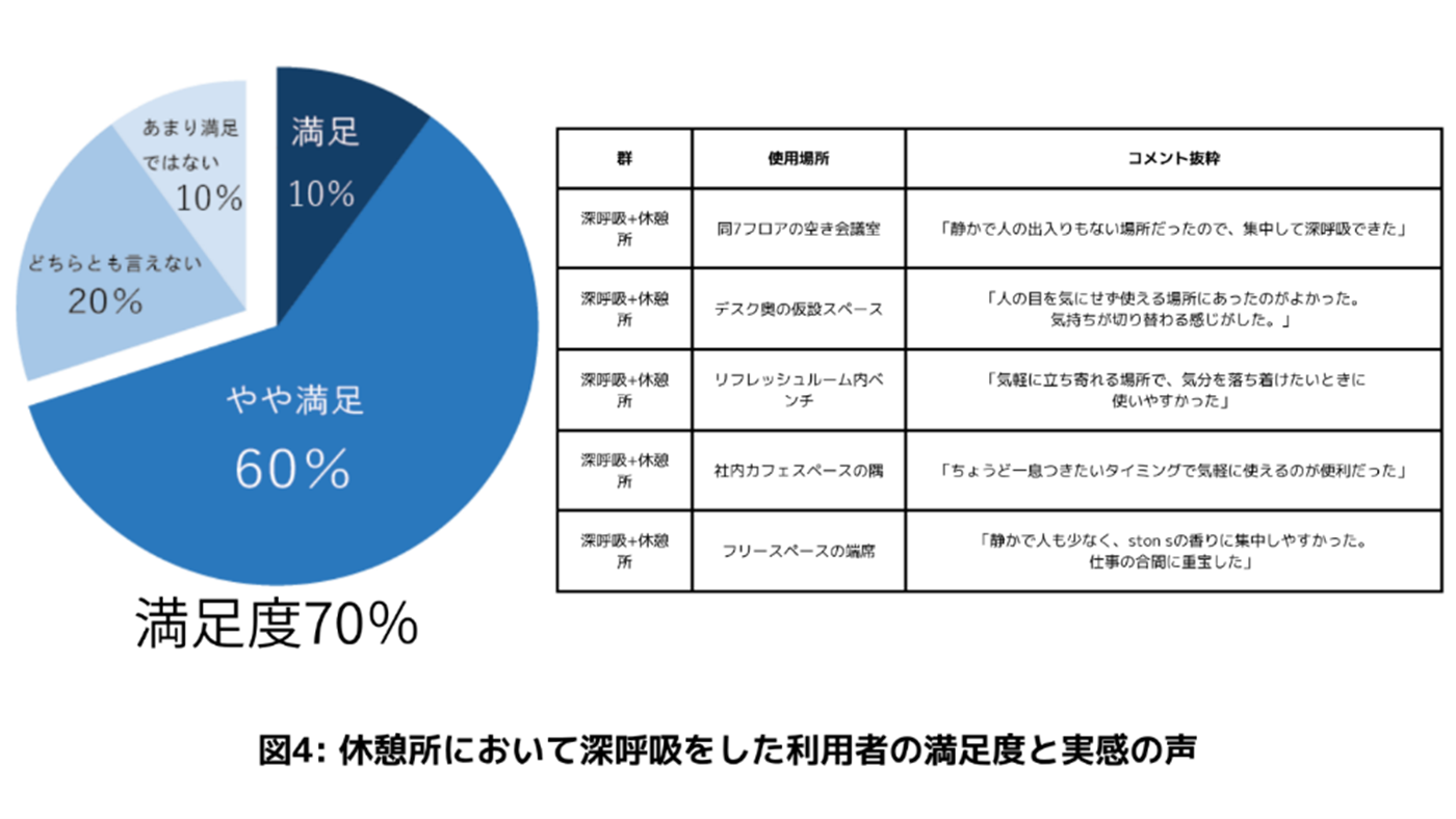 ston sを用いた深呼吸に対する満足度調査では、6週間深呼吸を休憩所で実施している利用者では、満足度が70%と高い値を示していました。自由記述からも「静かな場所で集中して使えた」「手軽に気分を切り替えられた」といった声が多く寄せられ、使用環境の特性は、ston sを活用した深呼吸の効果実感に加え満足度向上にも関わる重要な要素の一つと考えられます。