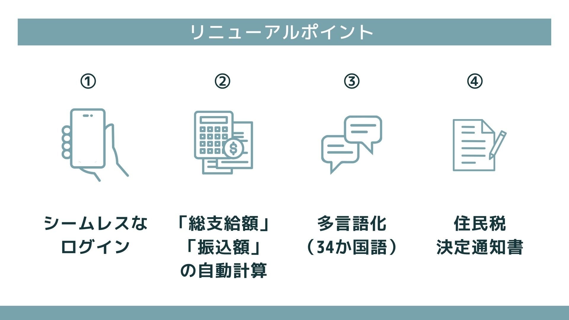 「多言語対応」や「住民税決定通知書の電子交付」などの新たな機能を搭載し、企業担当者、従業員双方にとってより高い利便性と業務効率の向上に貢献する新サービスとして、企業のグローバル対応やDXを推進し、多様化する働き方をサポートしてまいります。