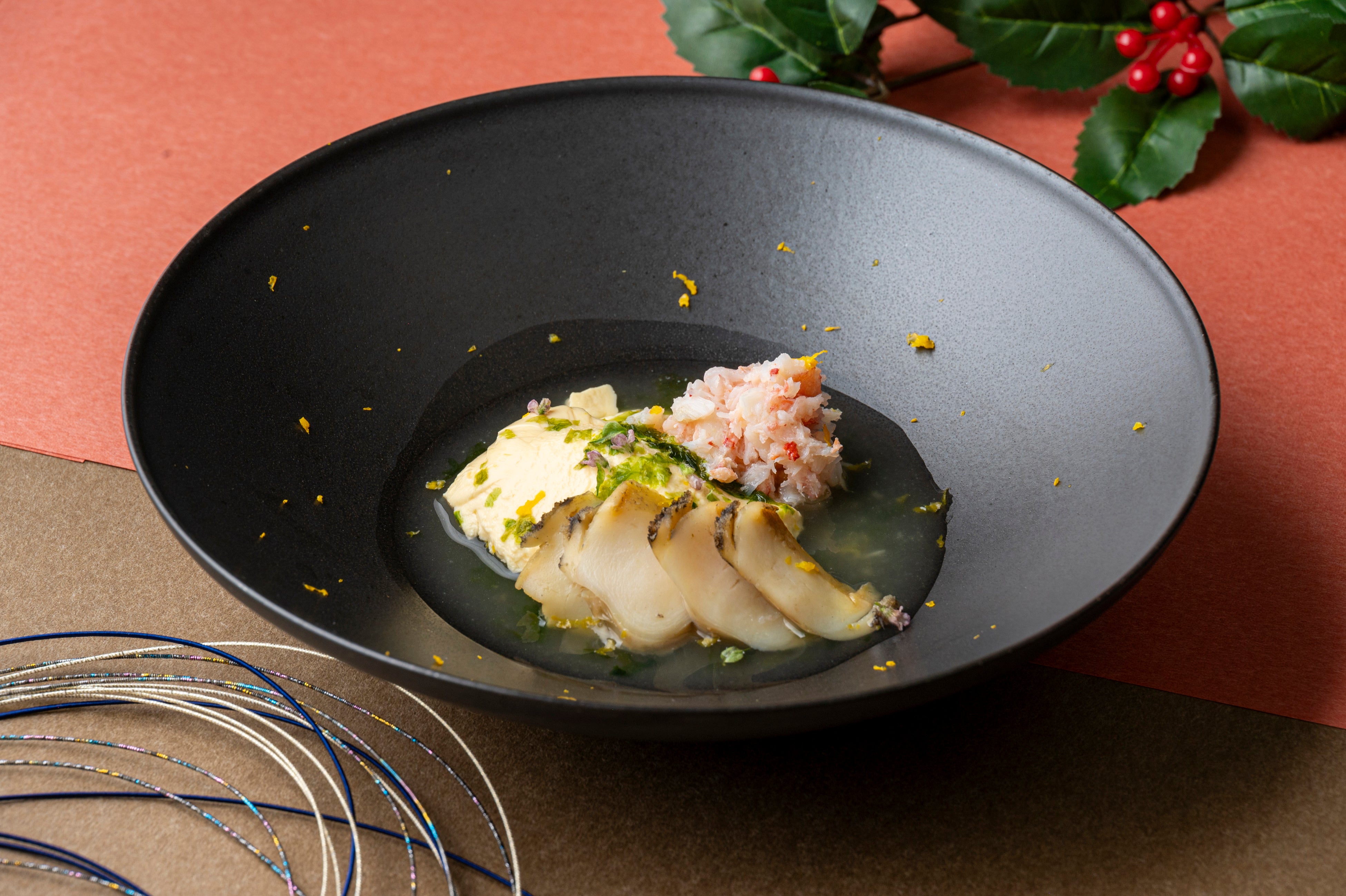 中でも、ディナーコースで提供する温前菜「鮑と丸ズワイガニ フランと磯香るスープ」は、ふくよかな蛤のだし香るフランに鮑と丸ズワイガニを添え、魚の旨みを感じるフュメドポワソンに岩のりを加えたスープで満たしました。ほぐしたカニの身と岩のりがスープをたっぷりとまとい、海の恵みを体にしみわたらせるような滋味深い味わいに仕上げました。心ほどける至福のコースで、ぜひお楽しみください。